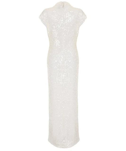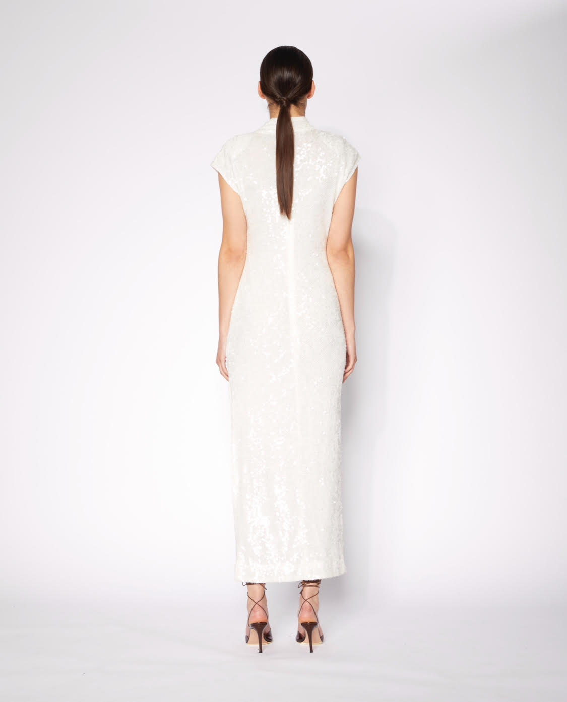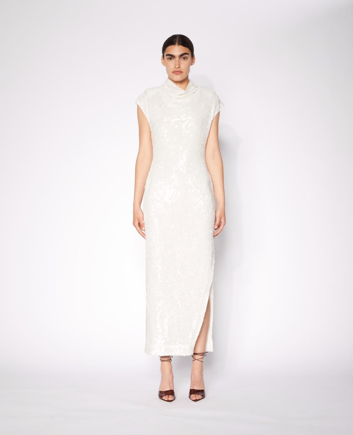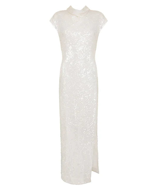 This relaxed silhouette is dripping in transparent sequins that glisten with every step, ensuring you shine at the alter or on the dancefloor. All of the embellishment is hand beaded by artisans, creating a piece that will be treasured for a lifetime.
