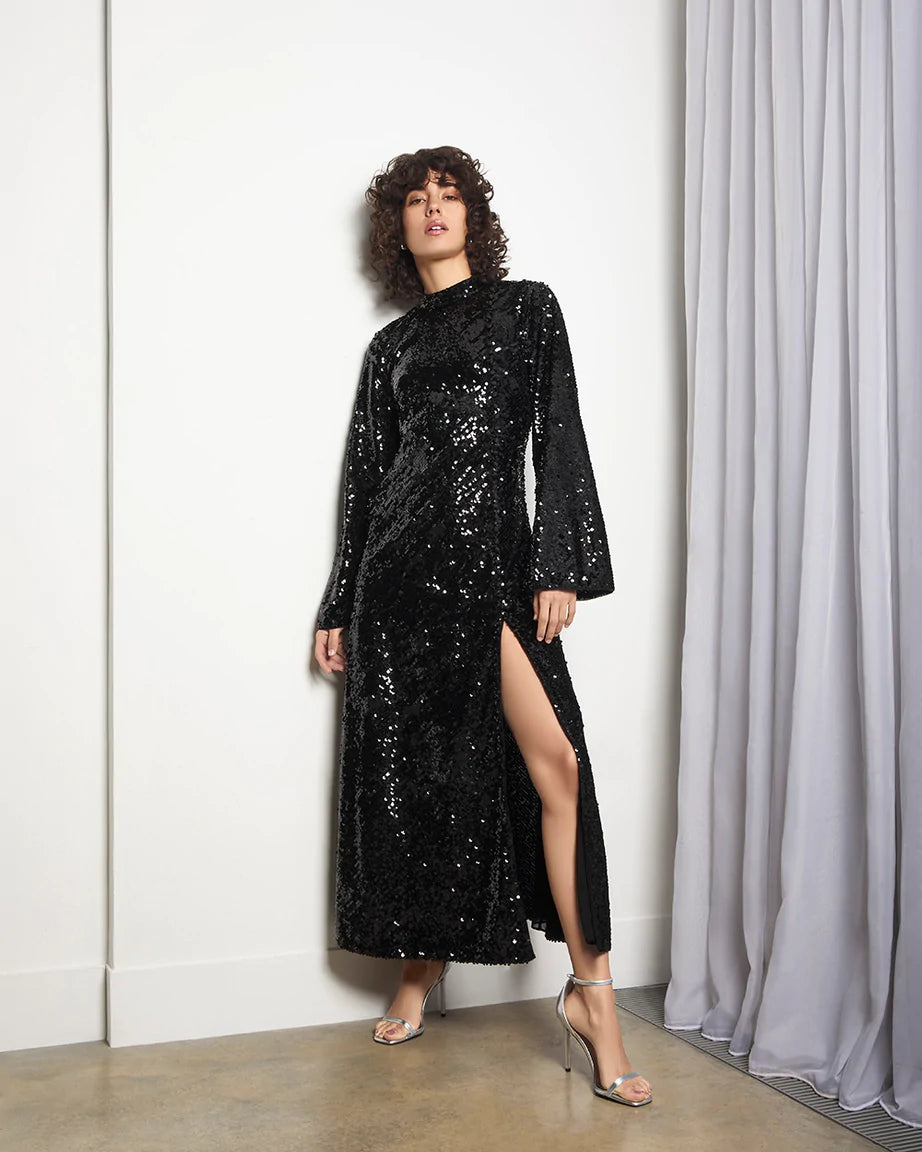 The Lena dress is the ultimate party piece, all over glossy black sequins with covered button detail, fluted sleeves and thigh split. This dress brings sparkle and glitter to the party.