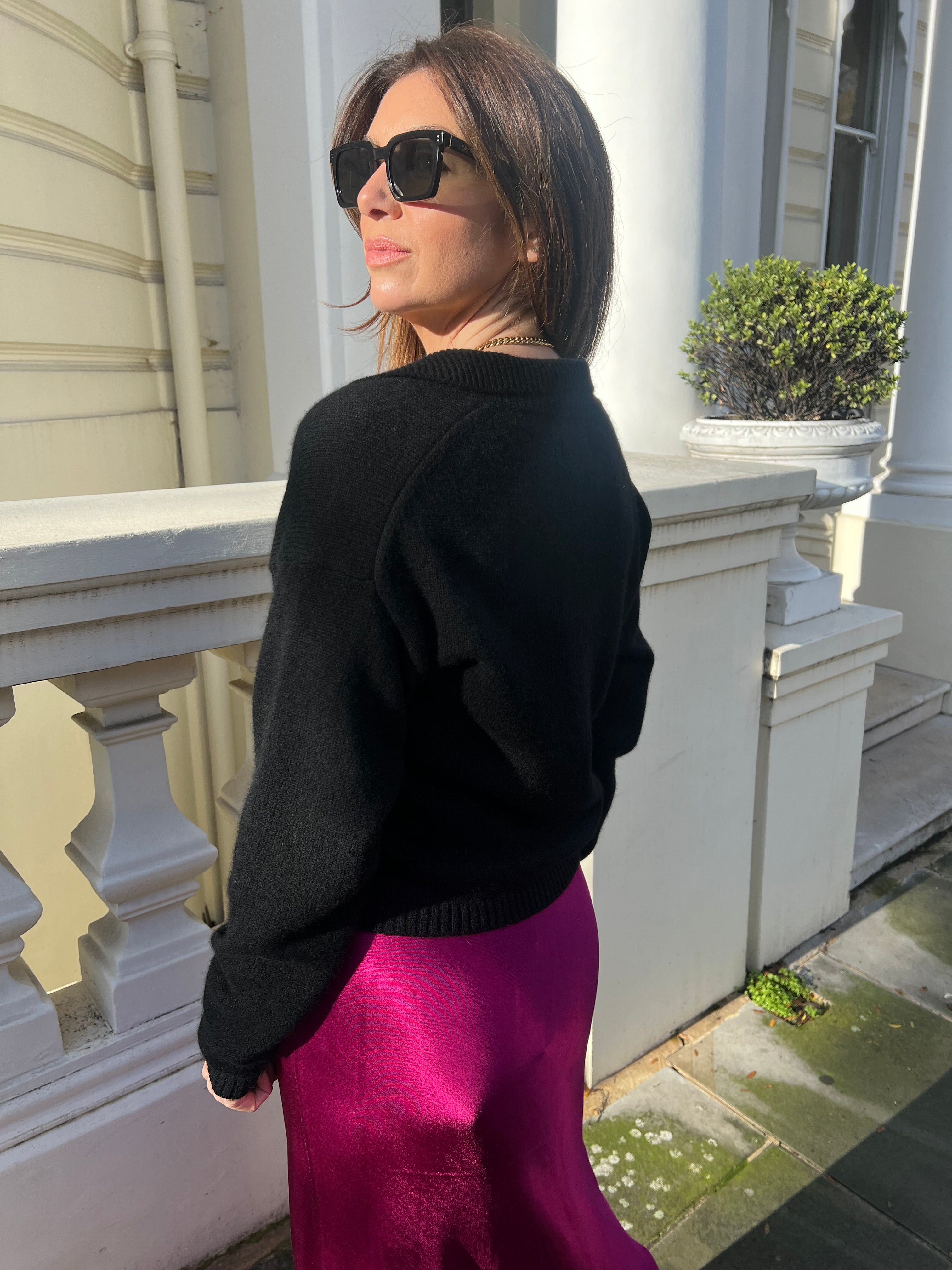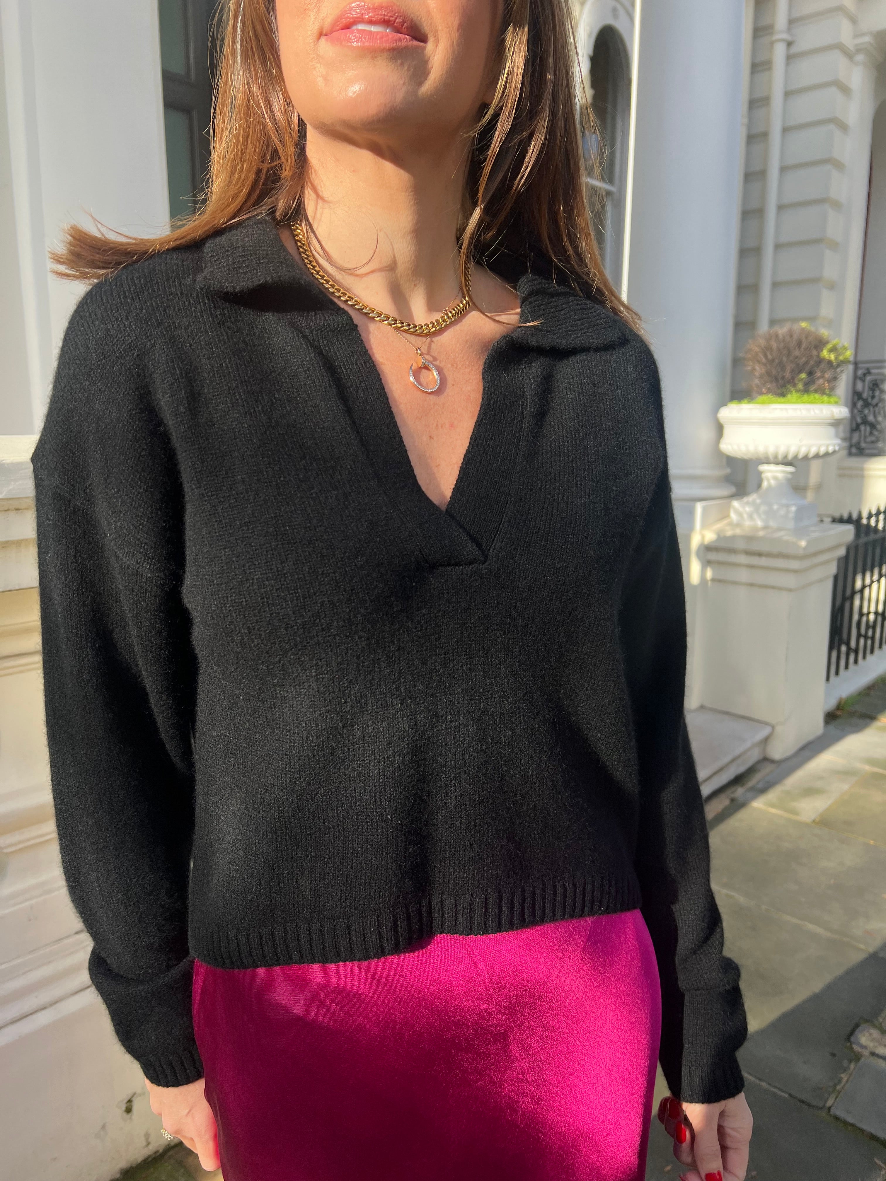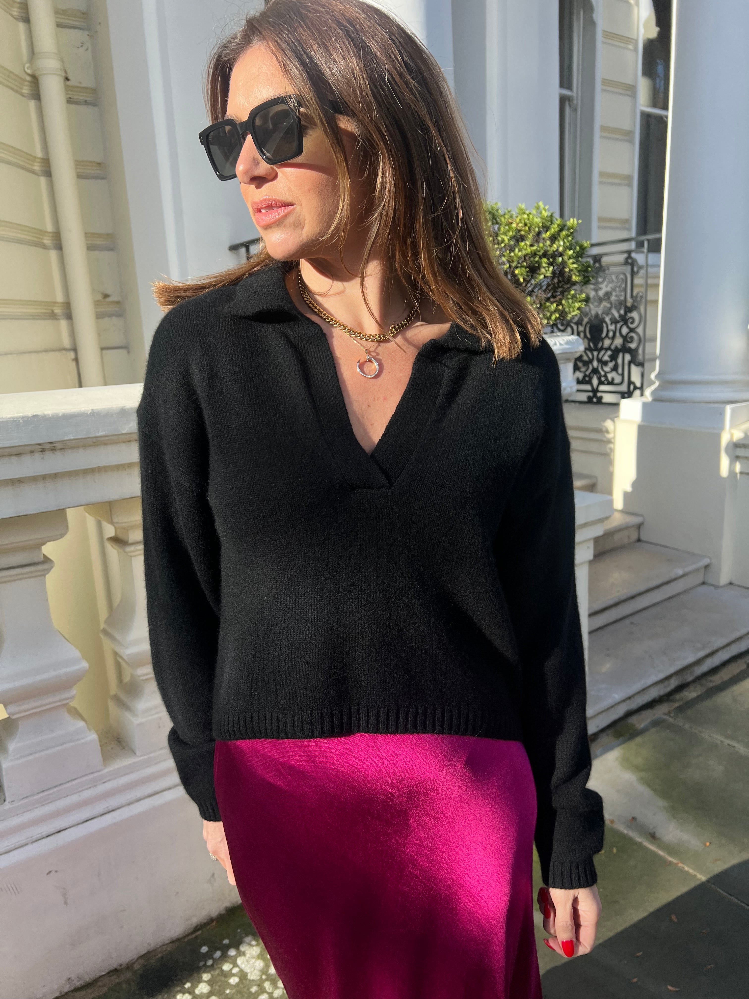 Jumper 1234 cashmere jumper. Heavier weight cashmere jumper (with a collar) in black. Slightly longer at the back. Slightly boxy fit but true to size.