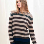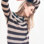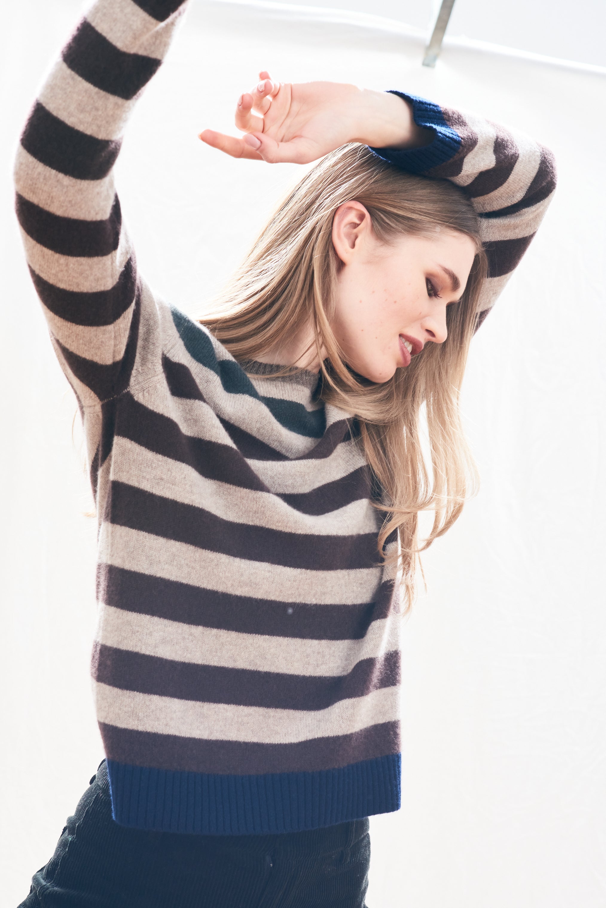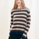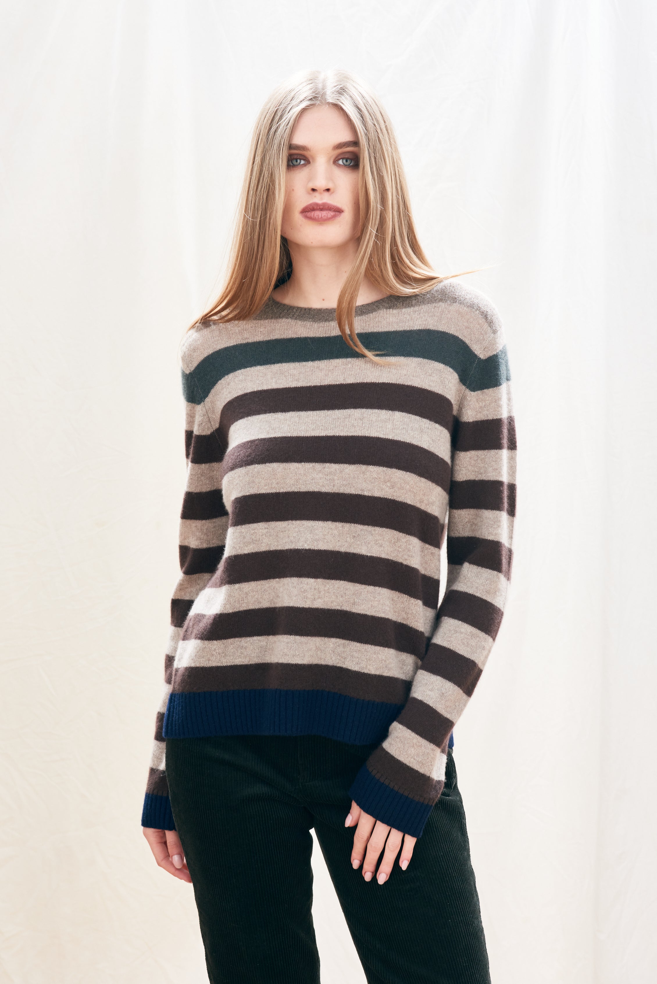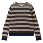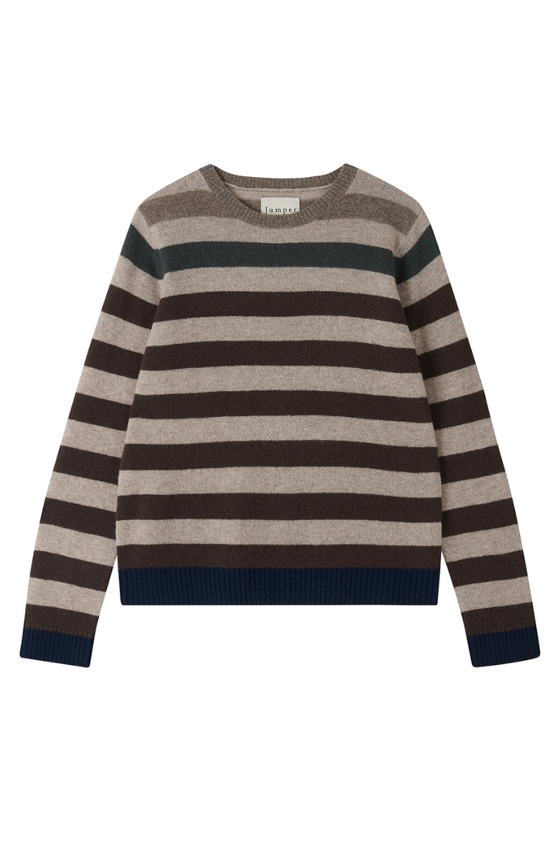 Jumper 1234 cashmere jumper. Lighter weight stripe cashmere crew neck in shades of organic light brown, dark brown and khaki. True to size.
