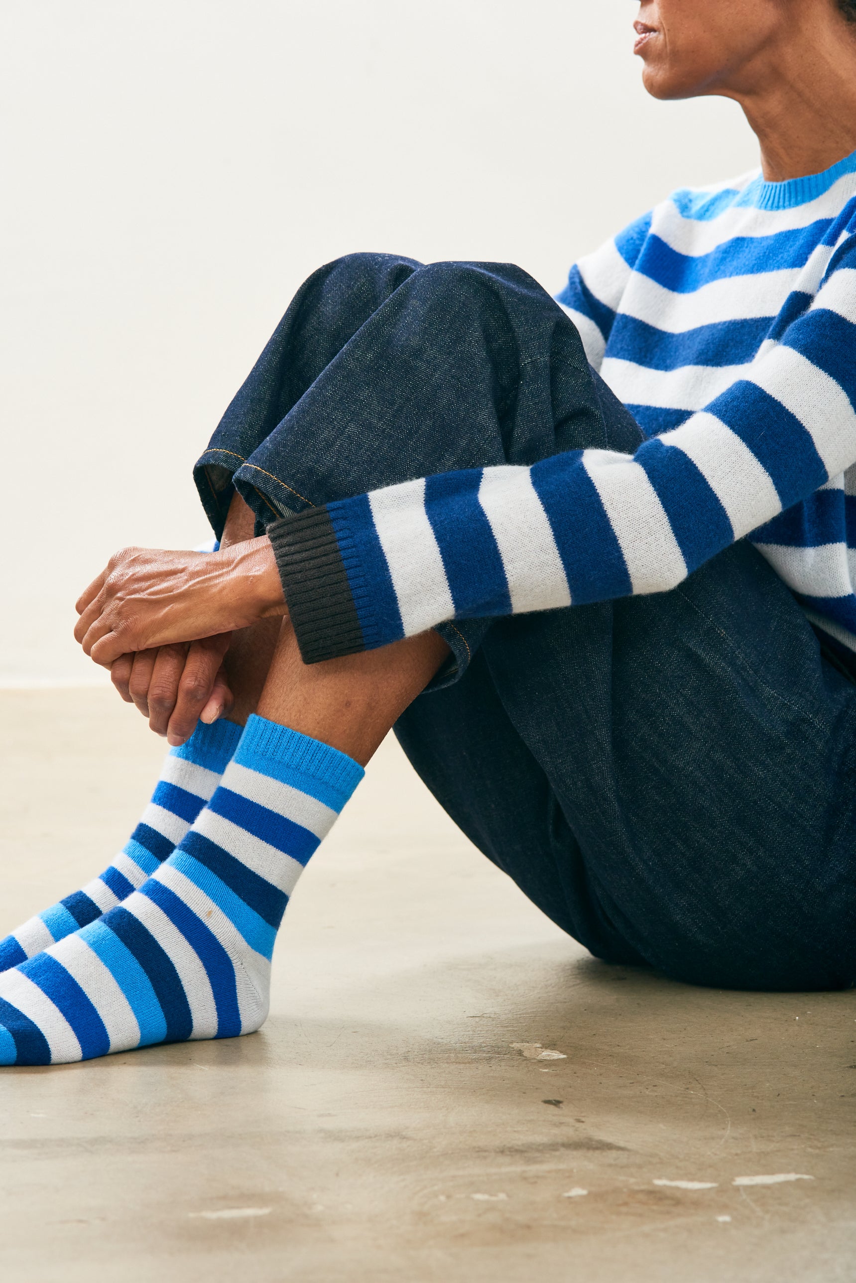 Jumper 1234 cashmere socks have arrived and we are in love! Short 'bed' socks in blue gradient stripes and dare we say, the softest socks in the world...but...don't wear them with your shoes. Keep them for cosy times.