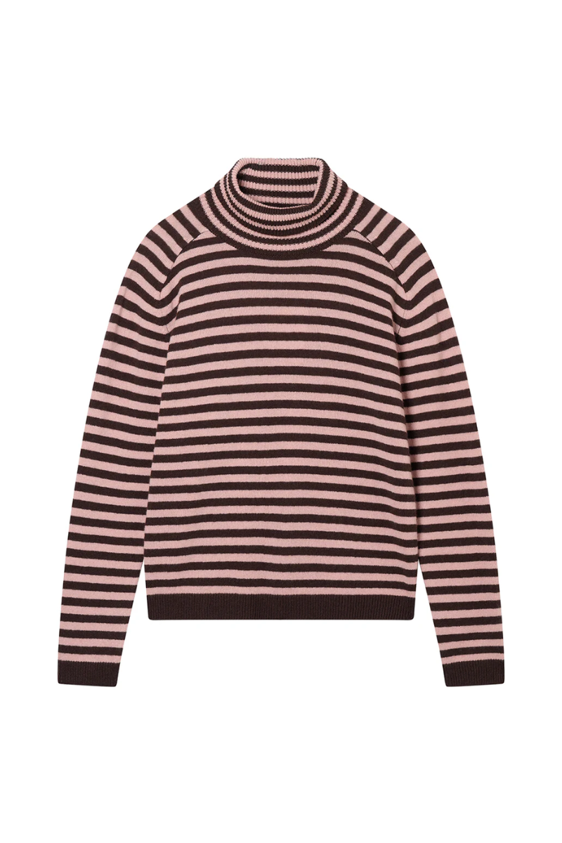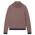 Jumper 1234 cashmere jumper with roll collar. Narrow stripes in Pluto brown and skin pink. True to size.