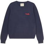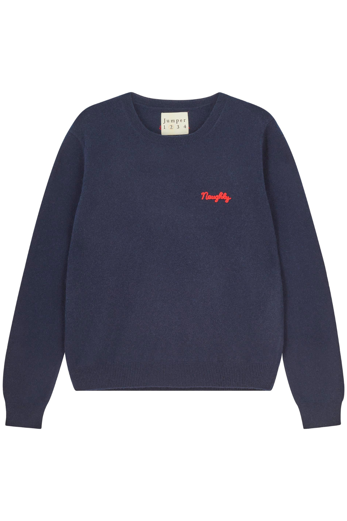 Jumper 1234 cashmere jumper. Navy cashmere crew neck jumper with cream 'naughty' chain stitch embroidery on the chest and 'but nice' on the back. True to size.