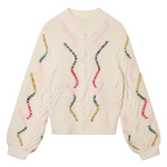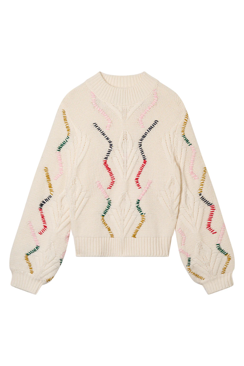 Jumper 1234 cashmere jumper with turtleneck. Cream cable knit with colourful contrast overstitching. True to size.