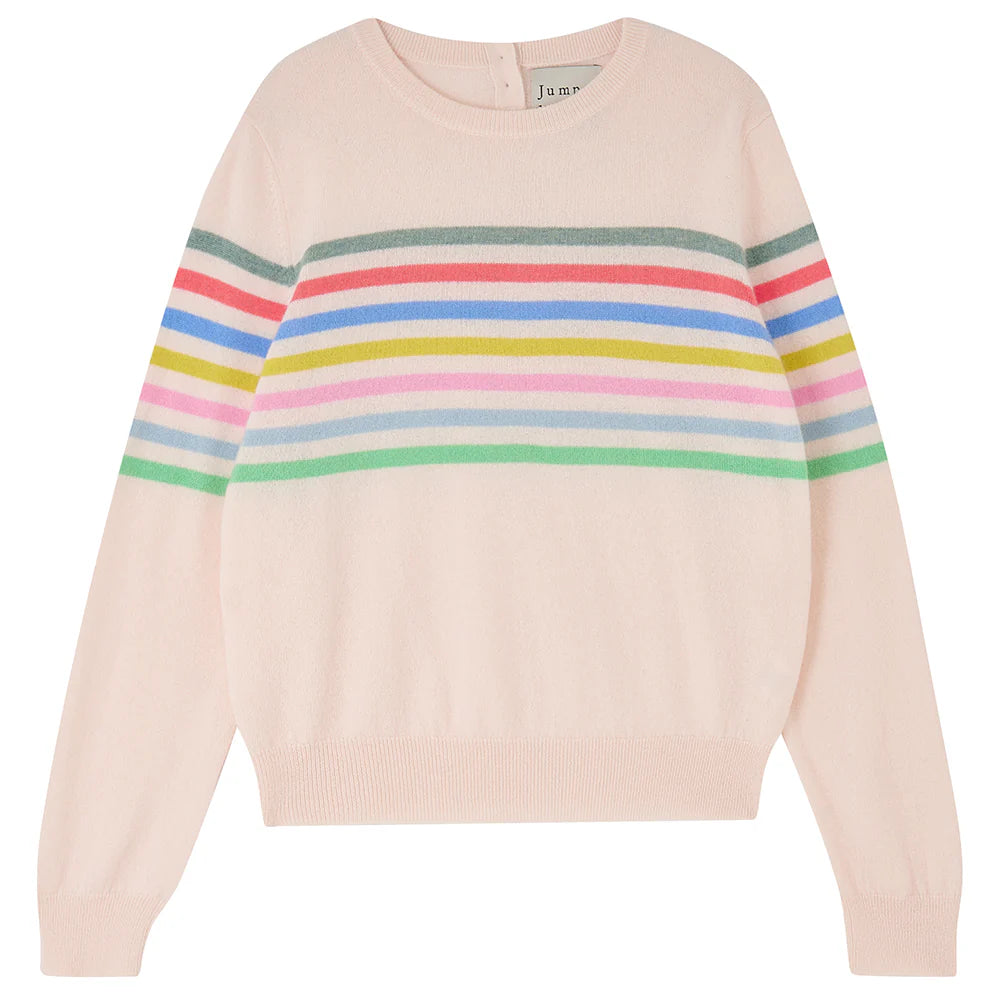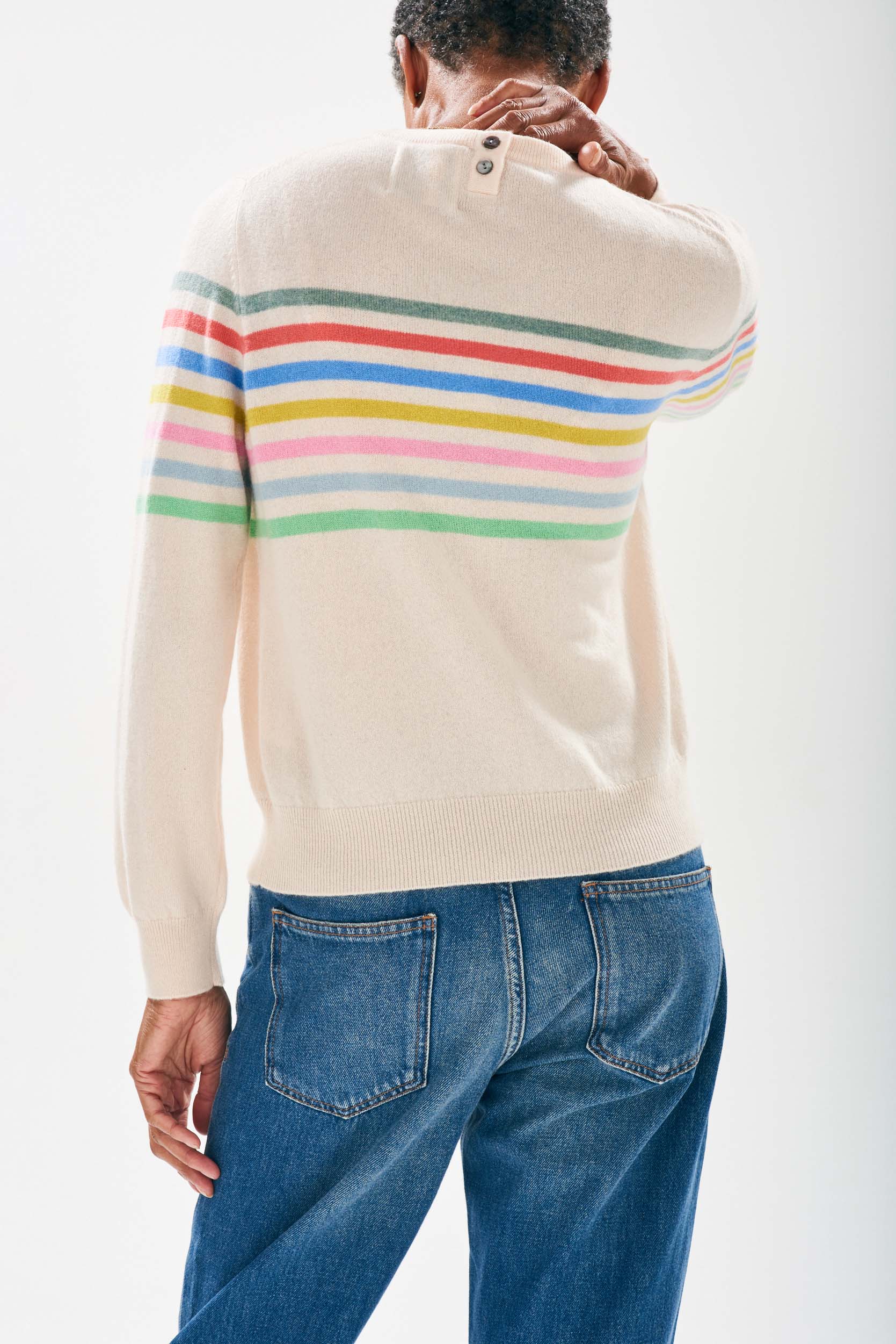Jumper 1234 cashmere jumper. Cream cashmere crew neck jumper with multi colour stripes, with a lovely button detail at the back neck. True to size.