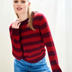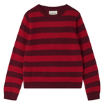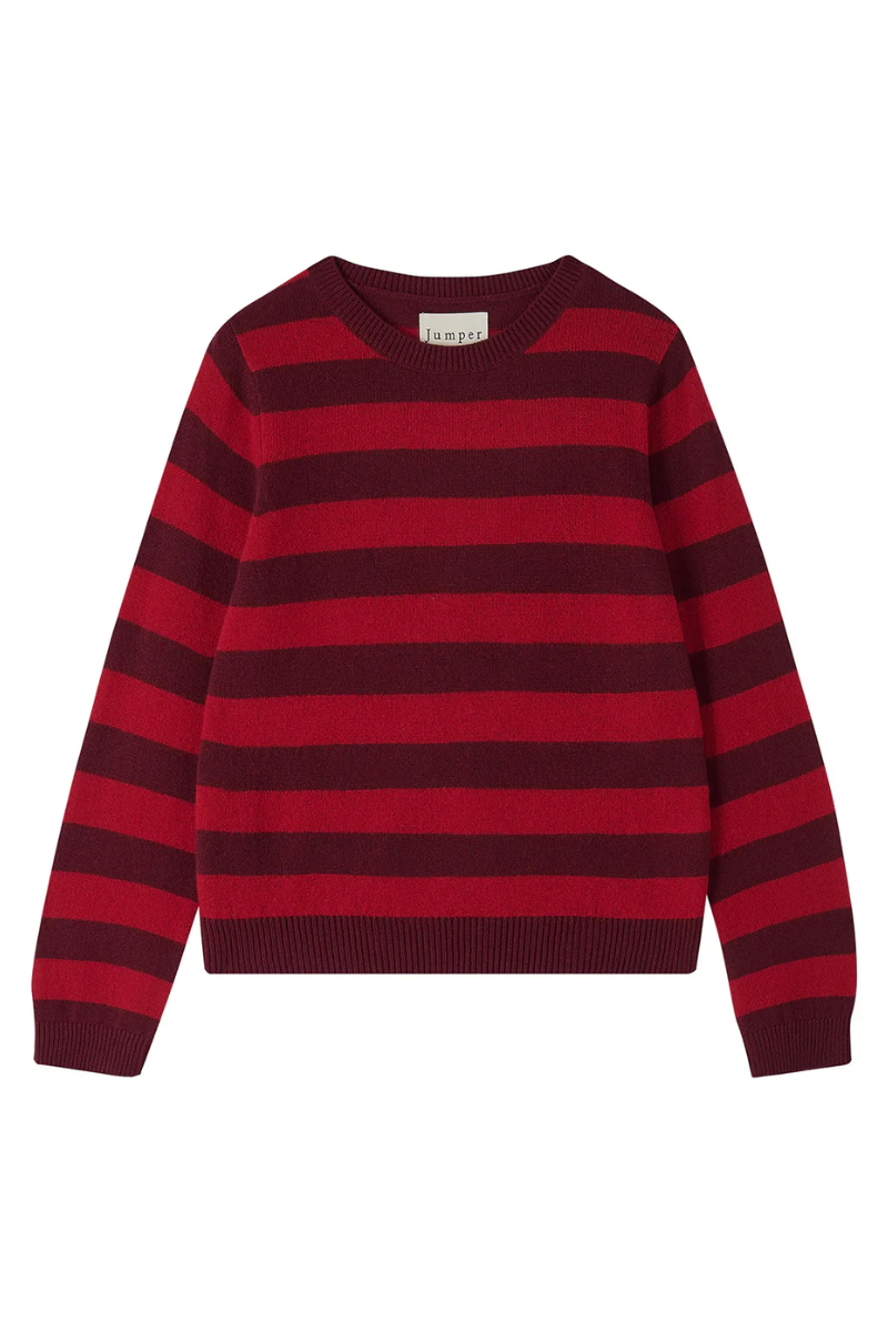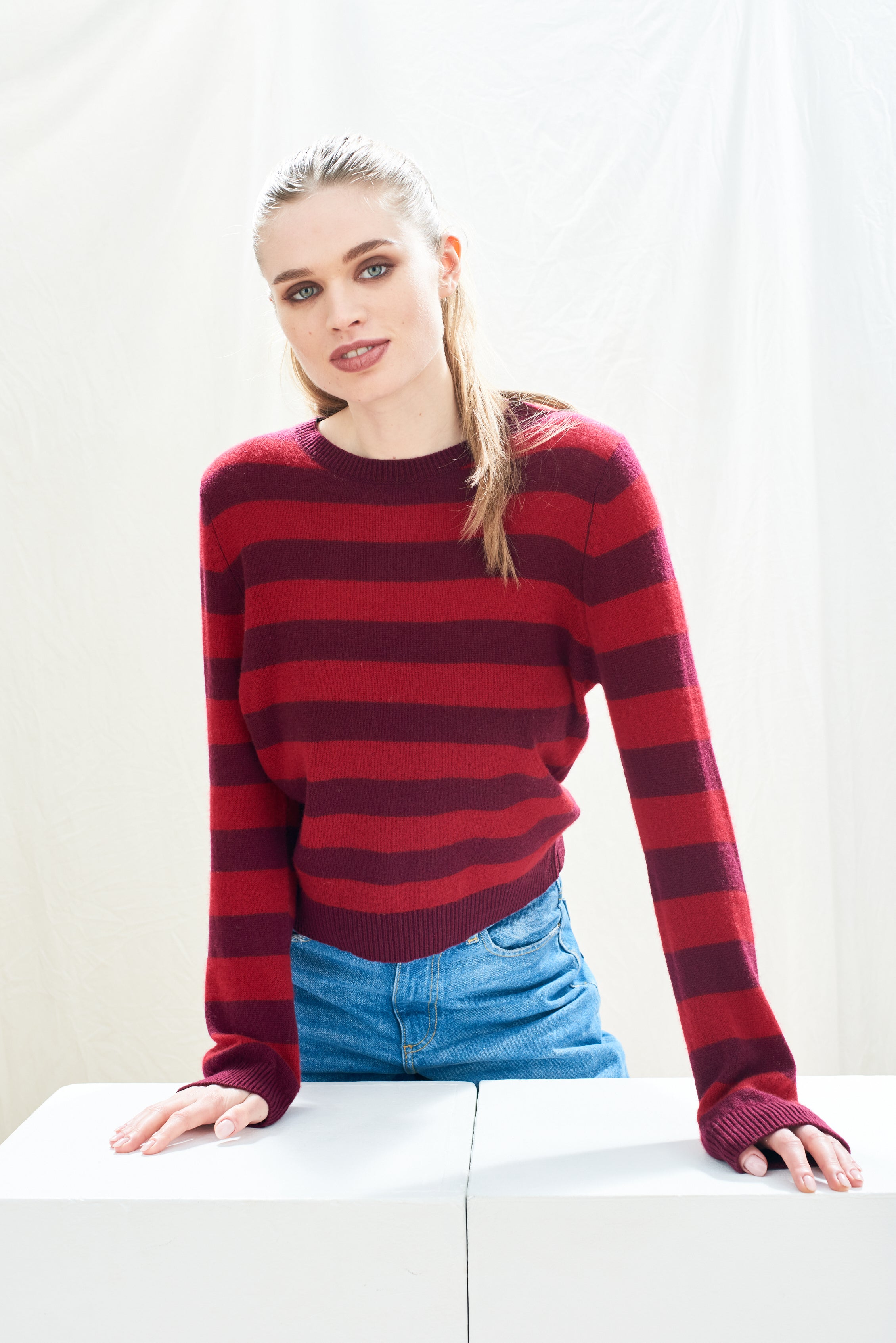 Jumper 1234 cashmere jumper. Jumper 1234's best selling lightweight cashmere stripe crew neck in burgundy and red. True to size.