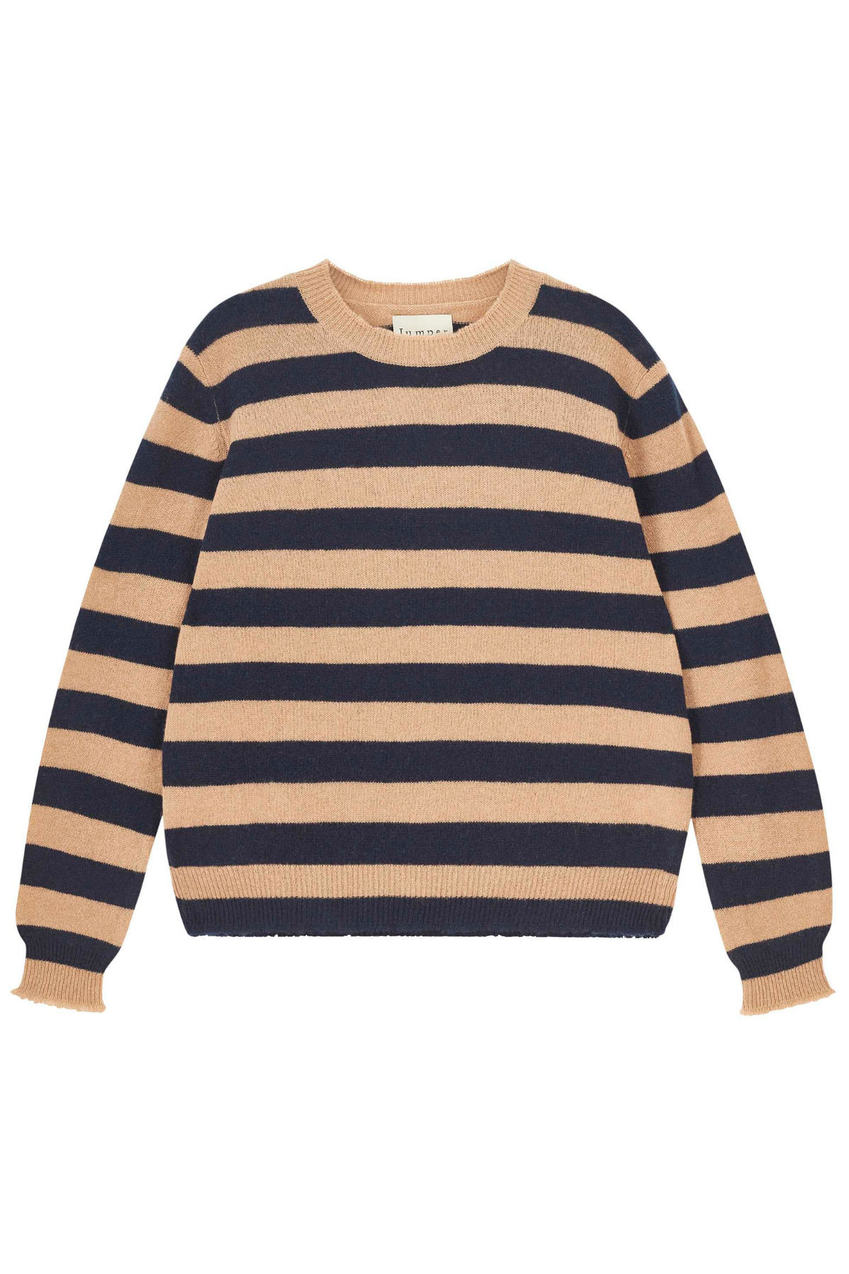Jumper 1234 cashmere jumper. Sandstone and navy stripe cashmere crew neck jumper, with distressed ribs. True to size.
