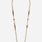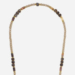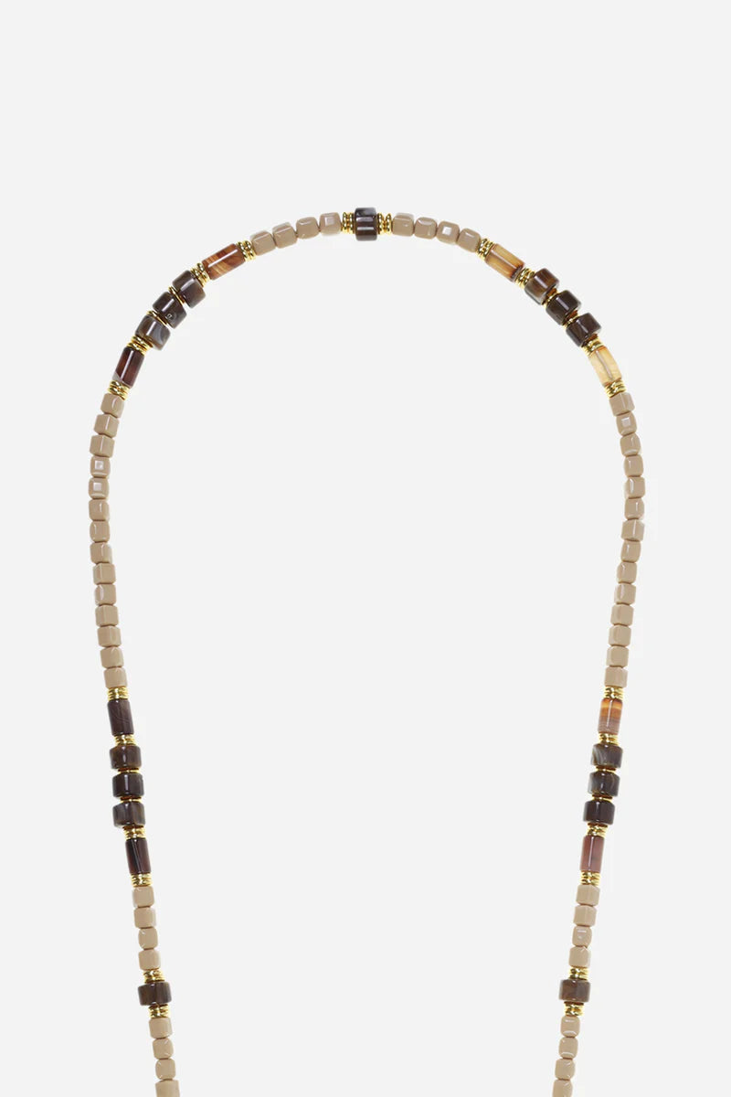 The jewellery chain measures 120 cm, in resin beads; sand, chocolate, amber and gold.