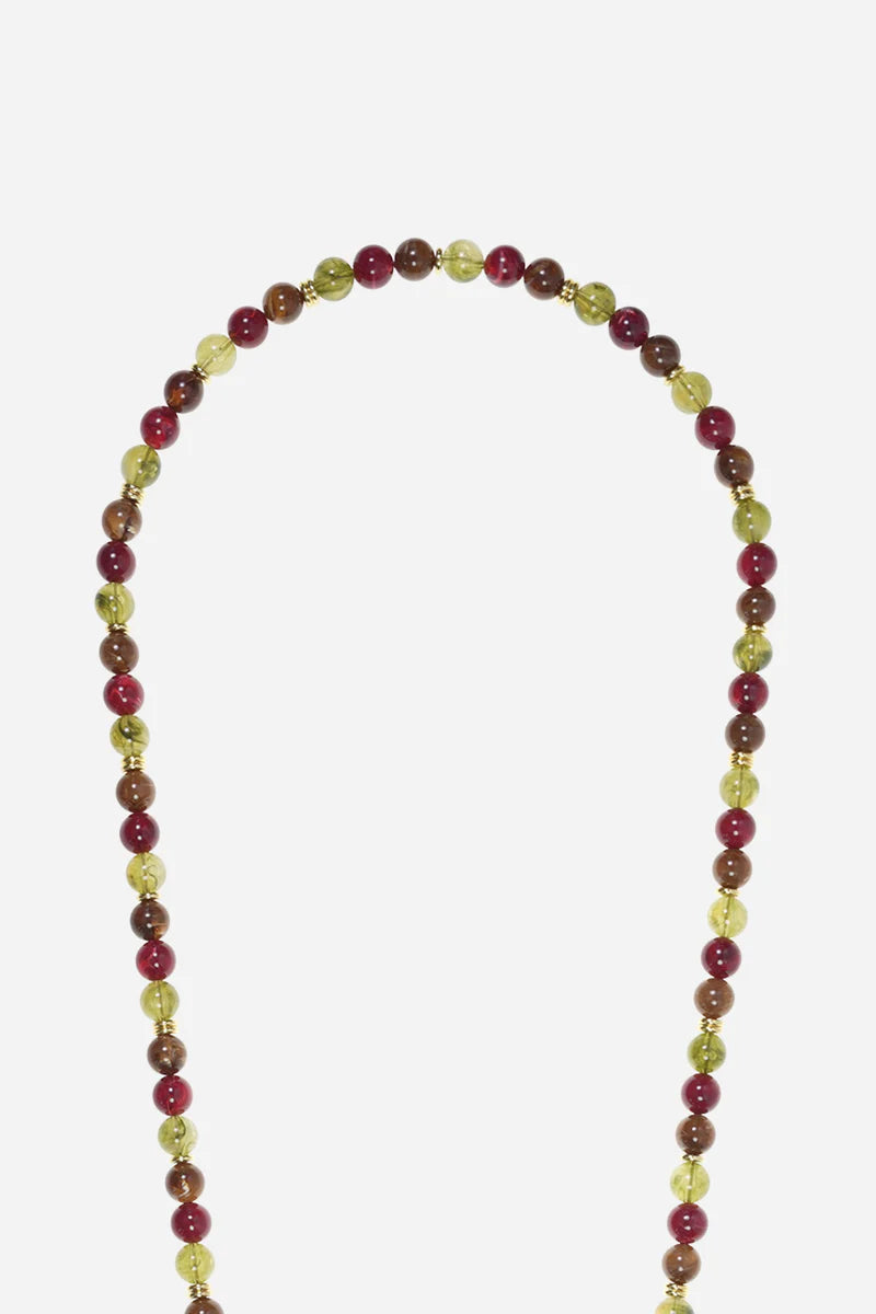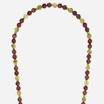 The jewellery chain measures 120 cm, in resin beads; olive, burgundy, khaki.