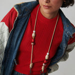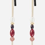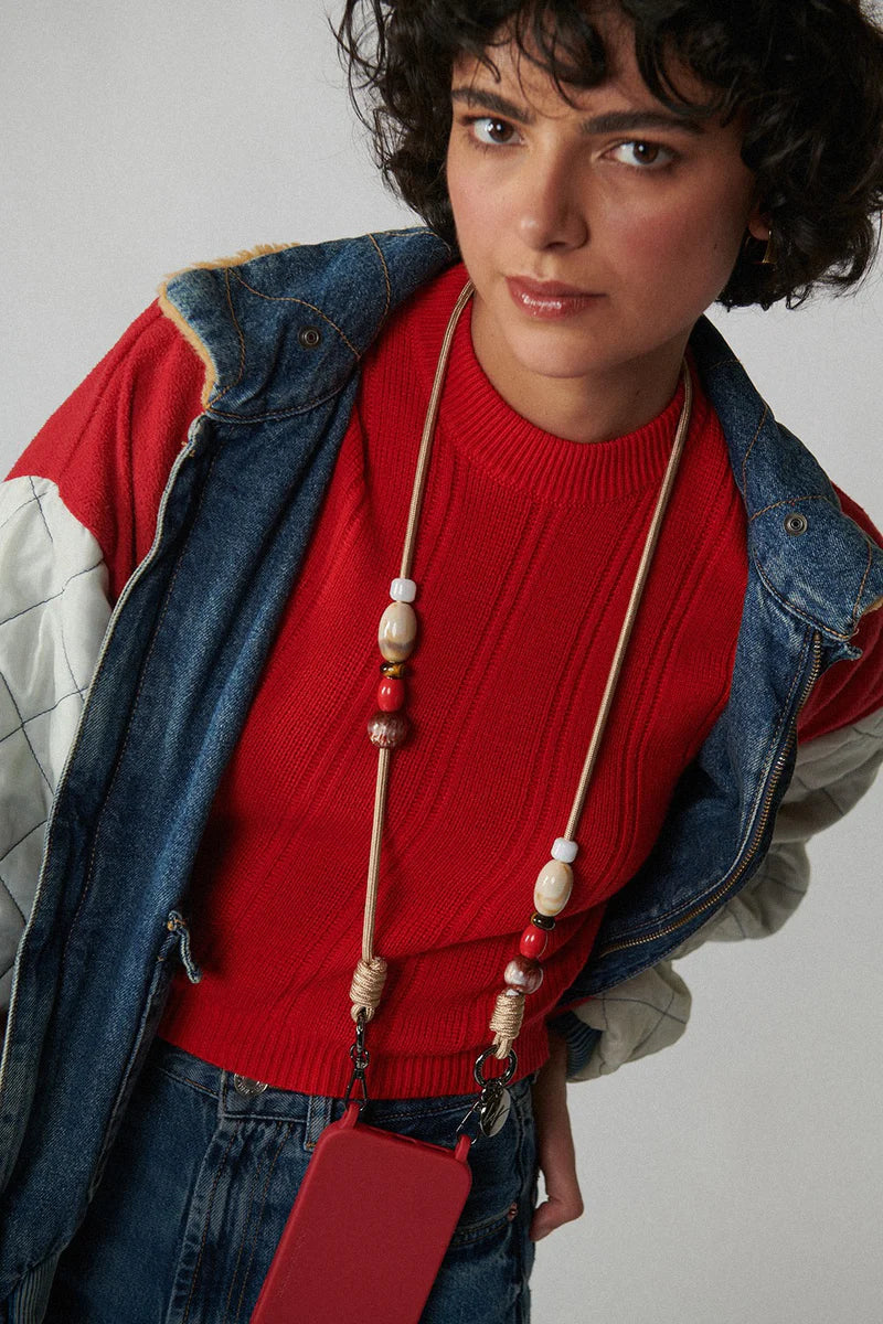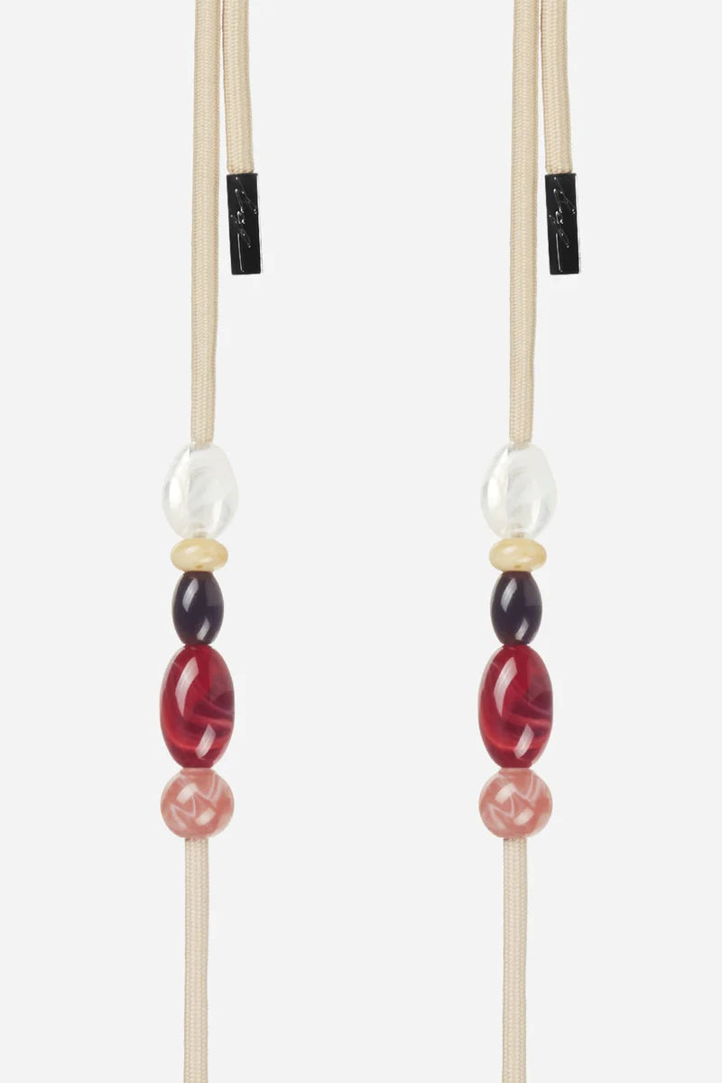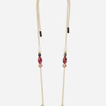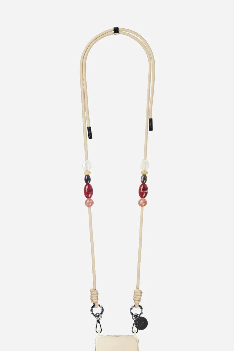 The phone cord measures 120 cm, in cotton. This one comes in beige with burgundy beads.