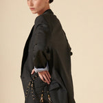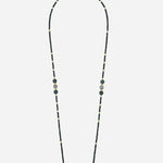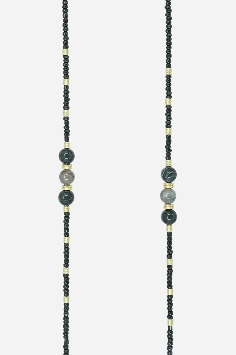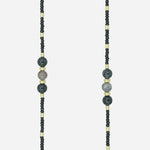 The Iris phone chain, in black pearls and beads, 120 cm long, clips onto ring cases or the adapter, with its gold carabiners. It was designed in Marseille and handcrafted in China.