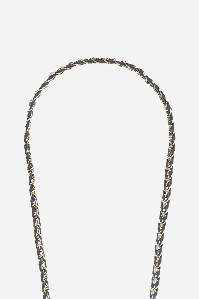 The jewellery chain measures 120 cm, in navy leather and gold coloured metal.