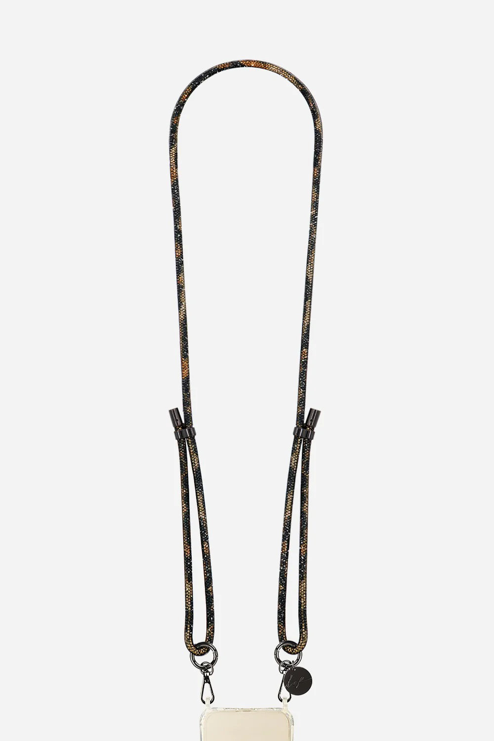 The phone cord is made of braided cotton, providing a pleasant texture to the touch. Adjustable, it can be worn in different ways, adapting to your needs, with a length ranging from approximately 90 to 170 cm. Multi coloured leopard print.