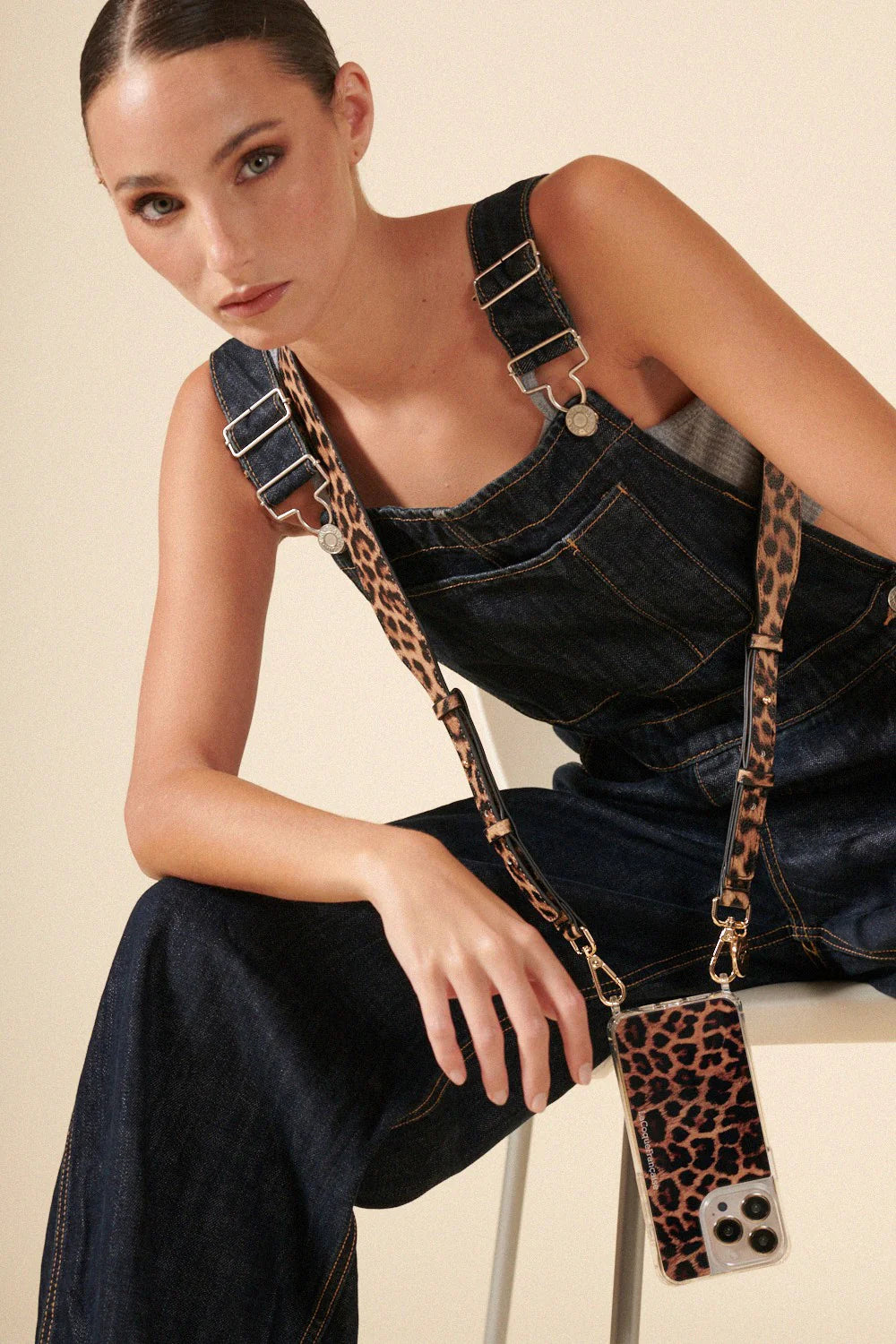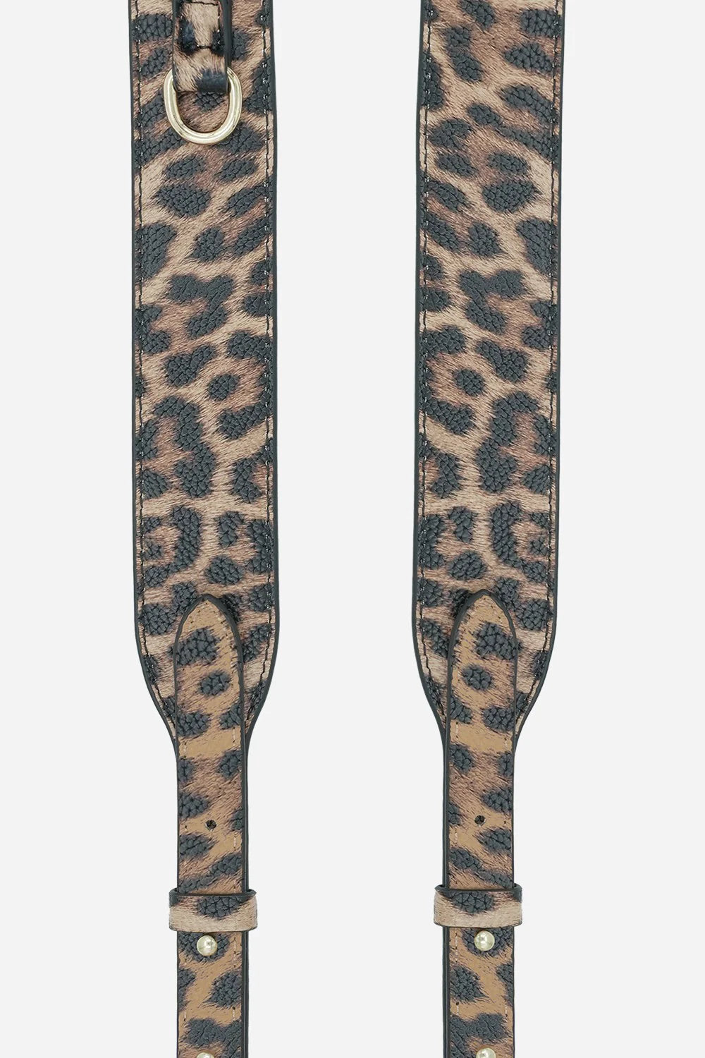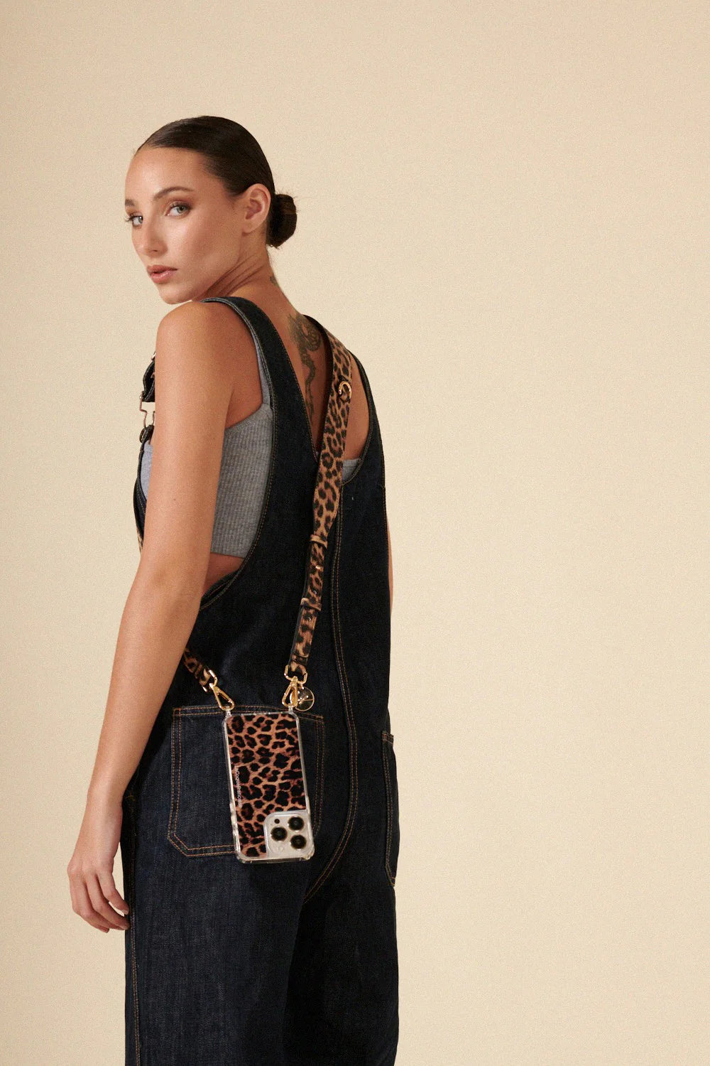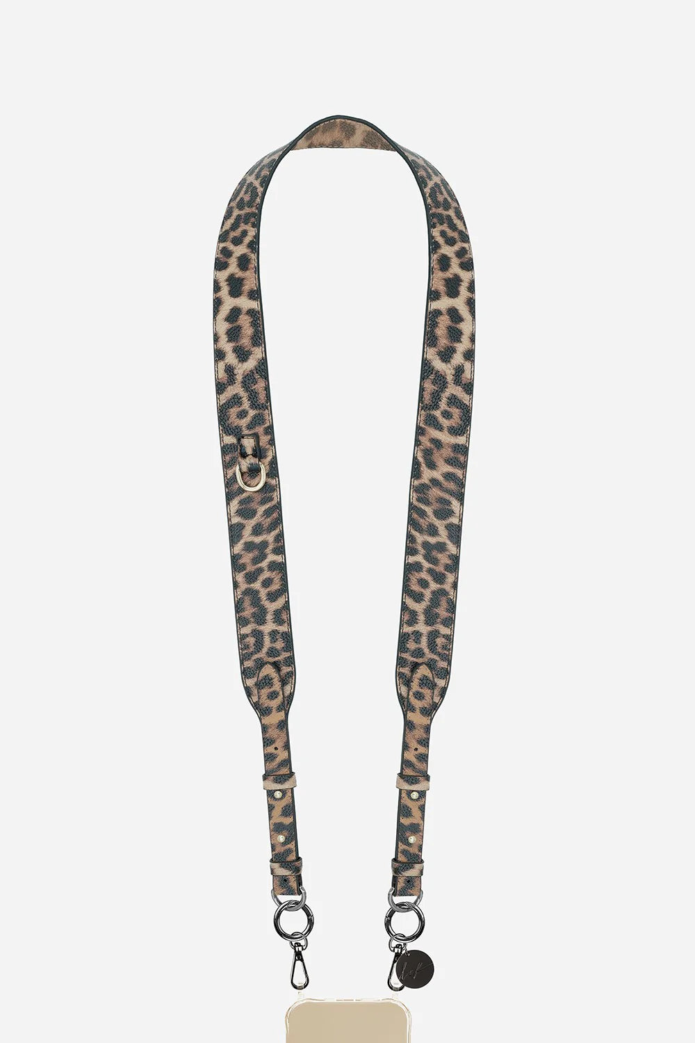 The phone strap measures 120 cm, and comes with metal carabiners and brown leo patterned vegan leather strap, engraved "LCF" medal.