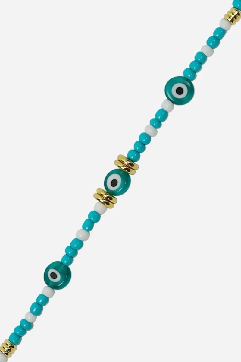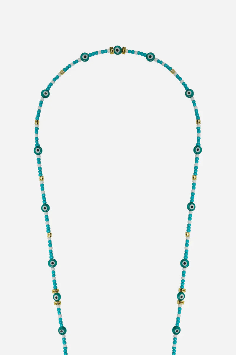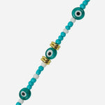 Coloured glass beads, copper beads and Greek eyes.