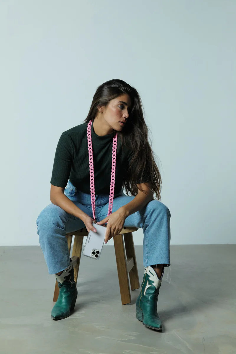 No need to look for your phone at the bottom of the bag or on your desk, it will follow you everywhere. Perfect for having your hands free while doing other things, the chains can be worn as a shoulder strap or necklace.