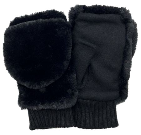 Cosy, fluffy mittens with the option to wear as a fingerless style or fold over for a full coverage. The fold is fastened on the top of your hand with a button and the faux fur is soft to the touch. Comes in black with ribbing around the wrist.