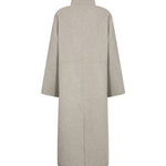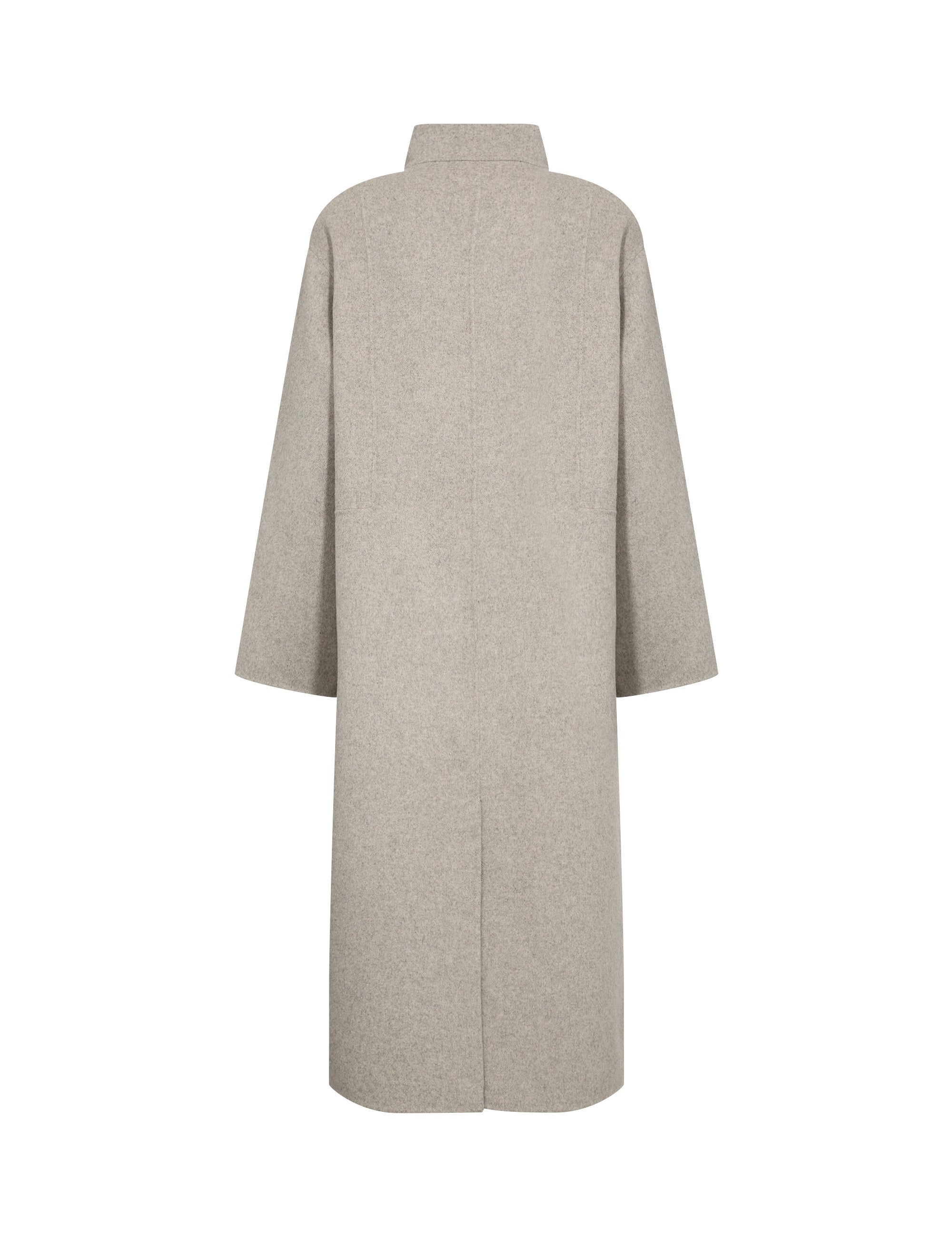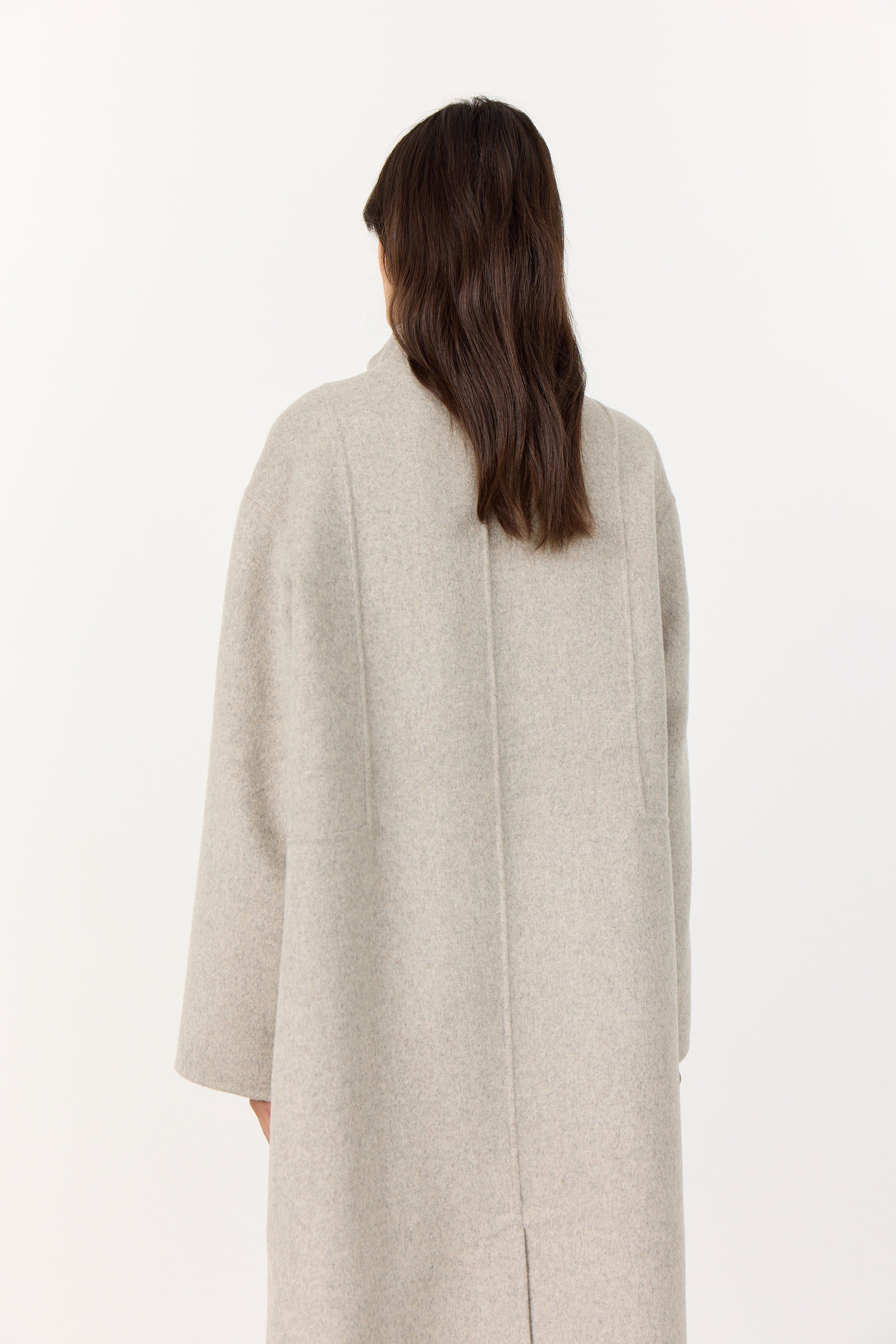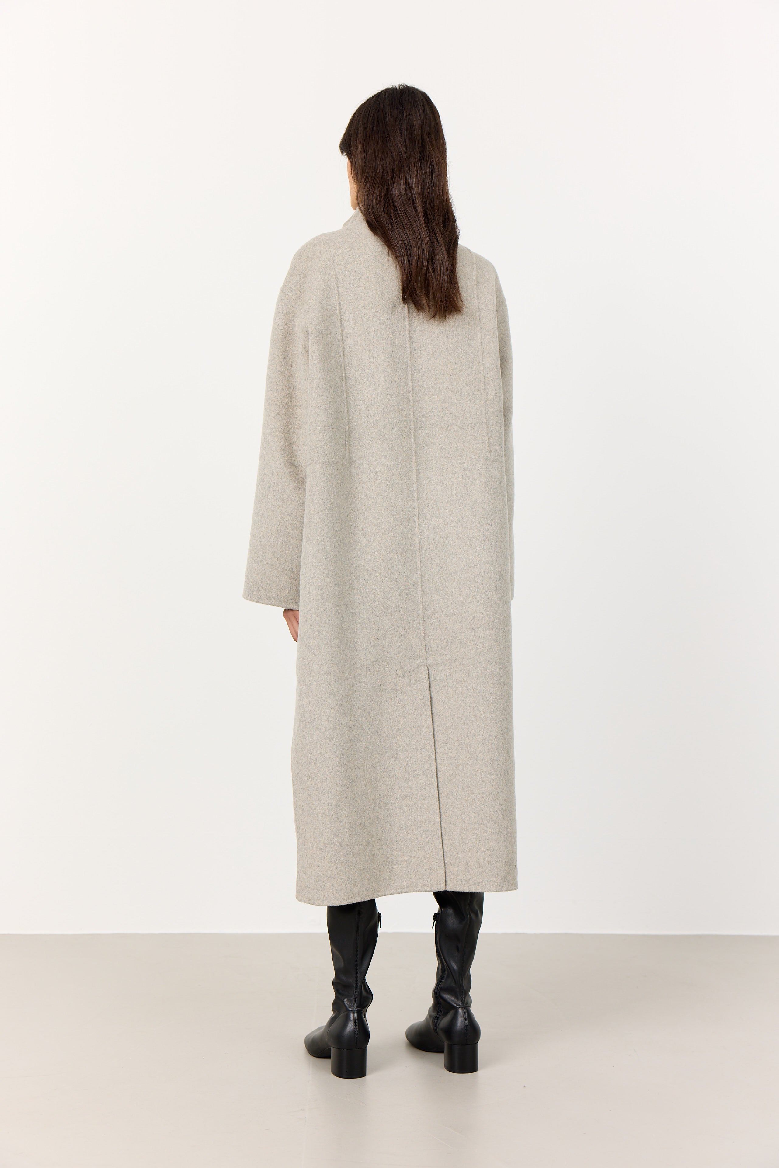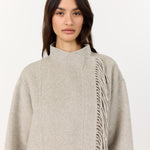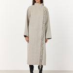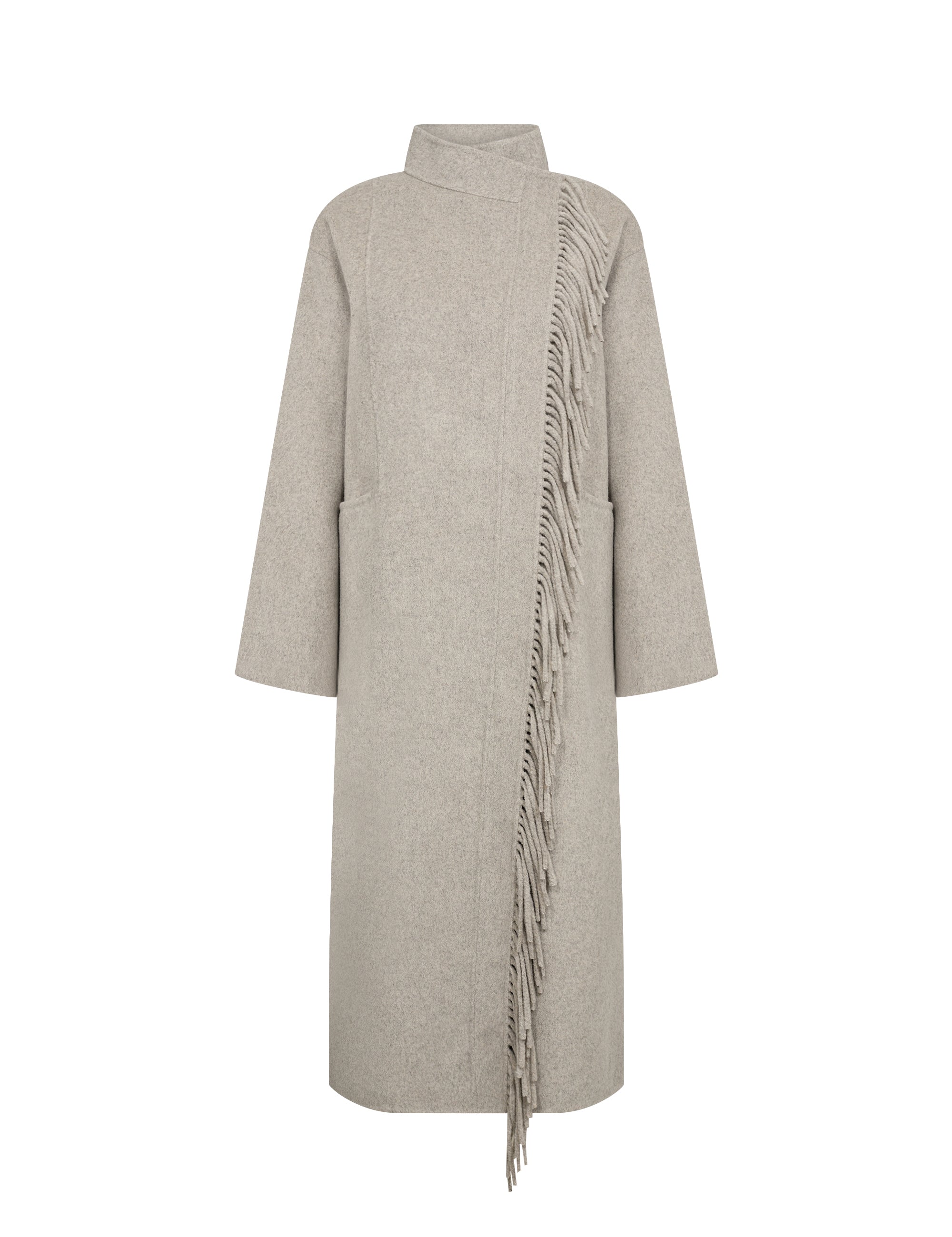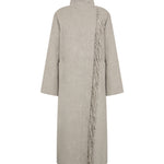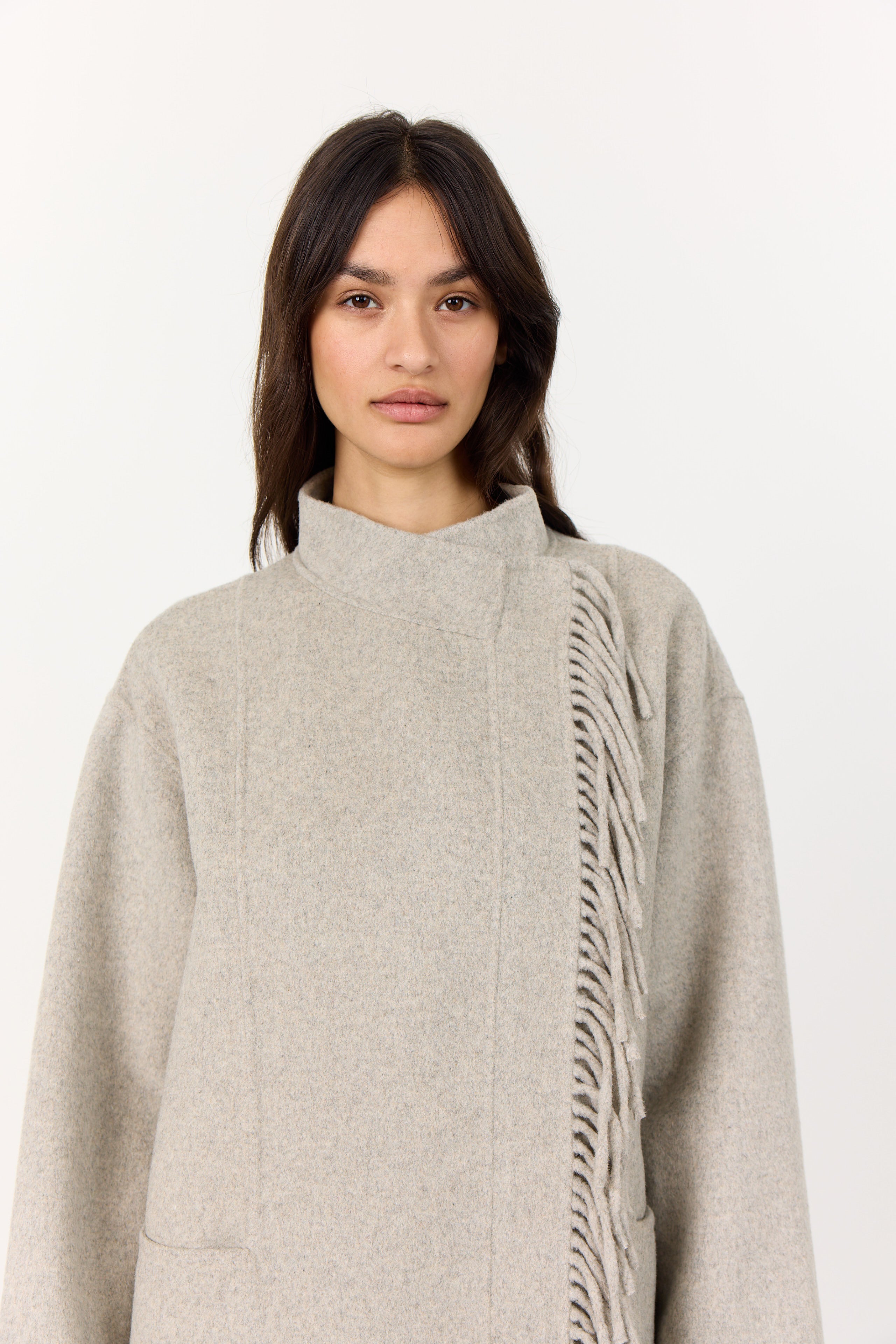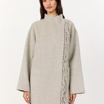 LR-OWA 35 is a minimalist Jacket crafted from 50% Recycled Wool, 30% Polyester, 20% Viscose. It features a high collar, asymmetrical button closure, and fringe detailing along the front. Pair it with tailored trousers or a sleek dress for a refined look.