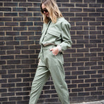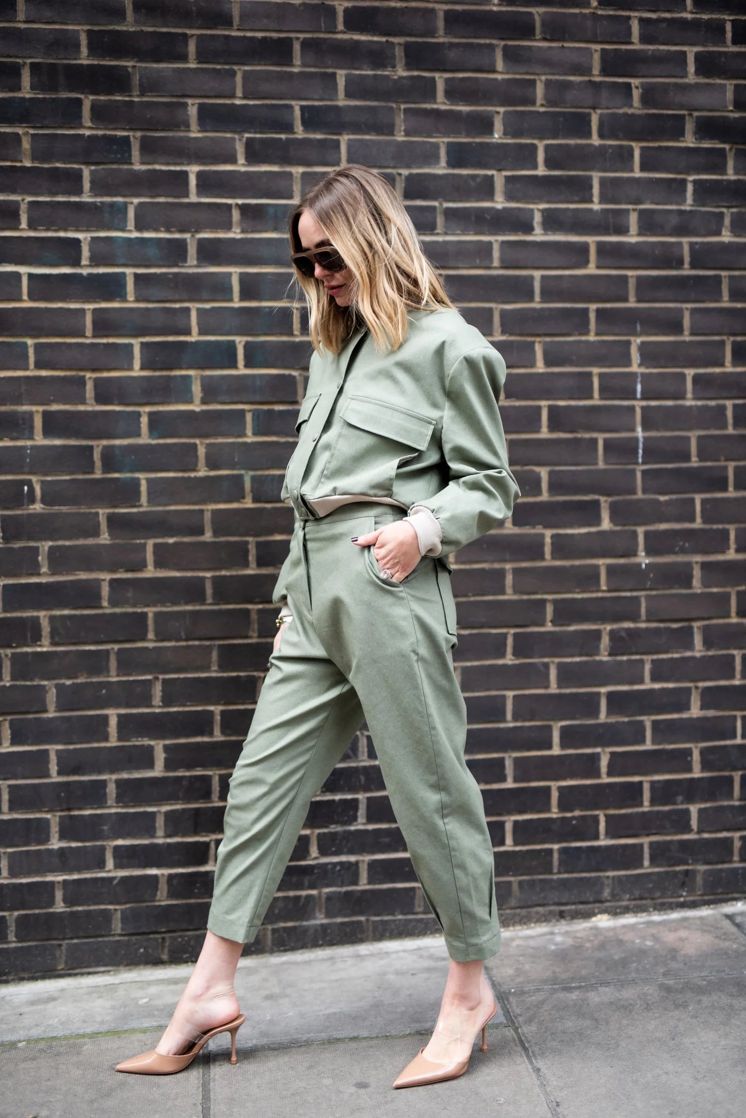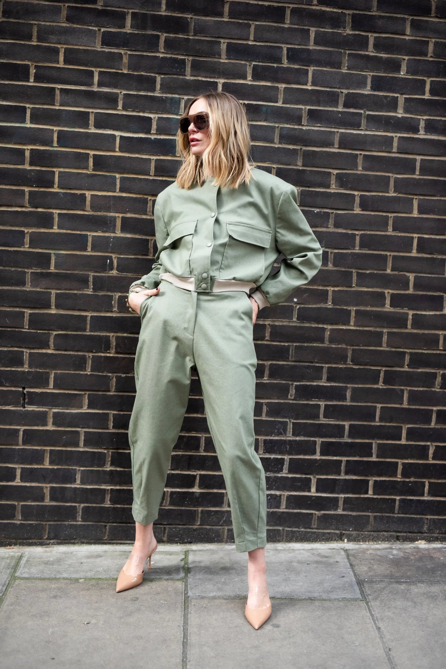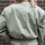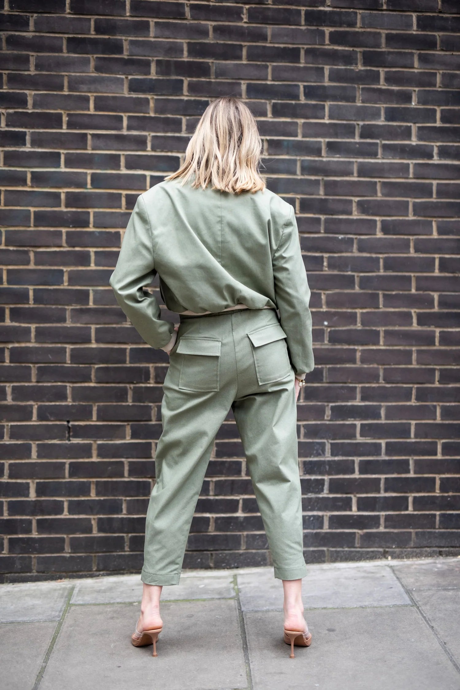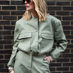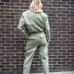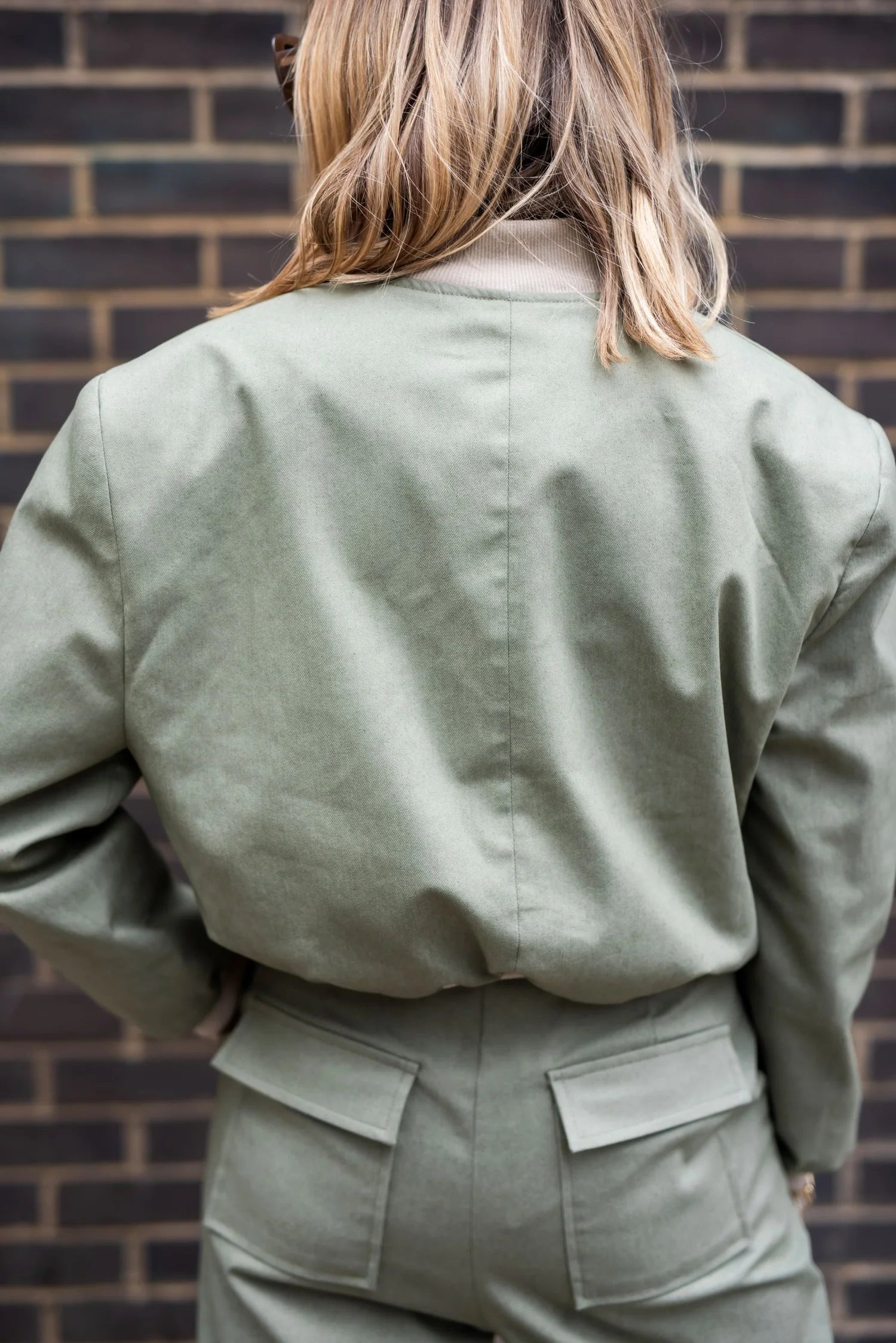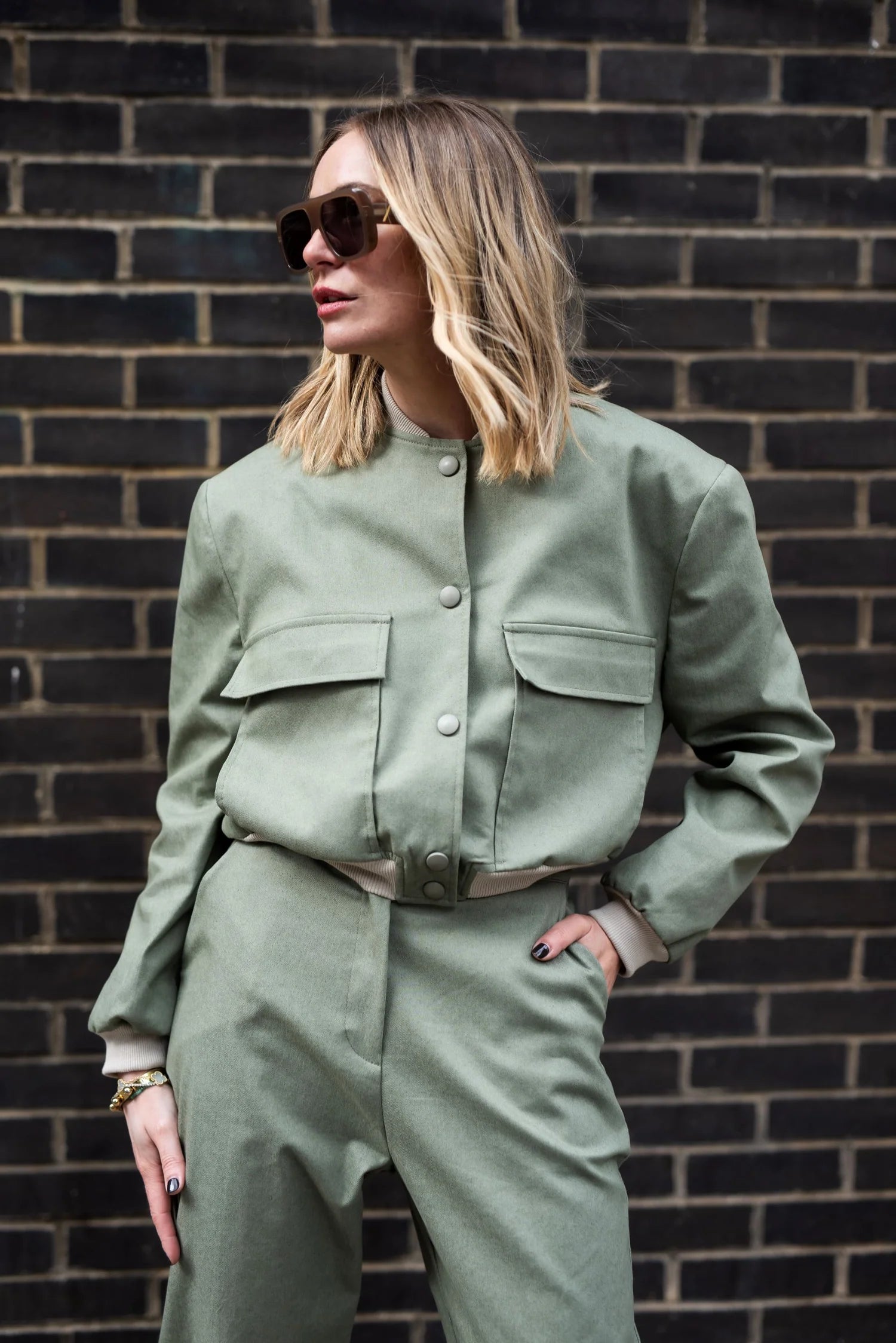 Cropped khaki bomber jacket with white ribbing and front pockets. The Alicia Bomber is the perfect mid-weight layer for spring and can be paired with the Alicia trousers to get the full look!