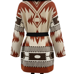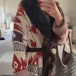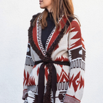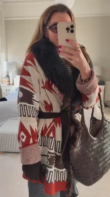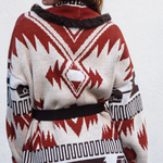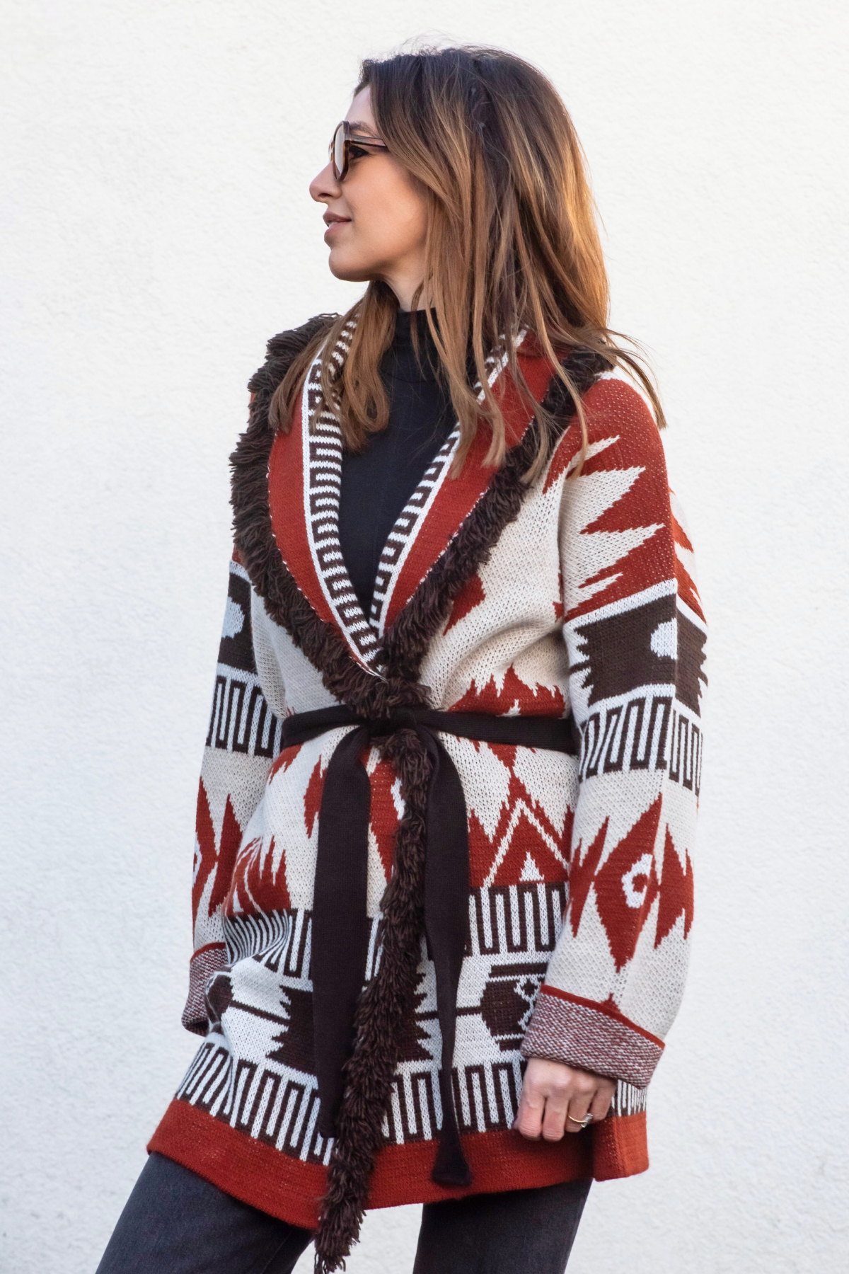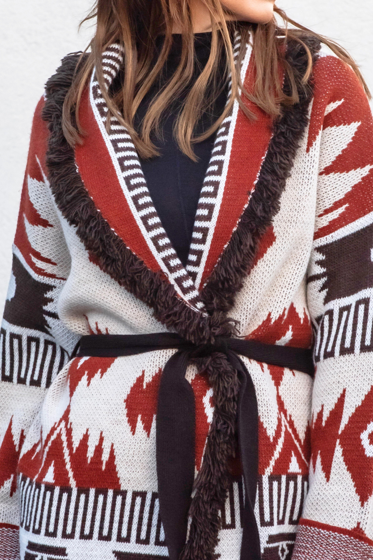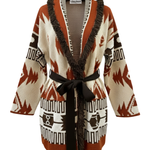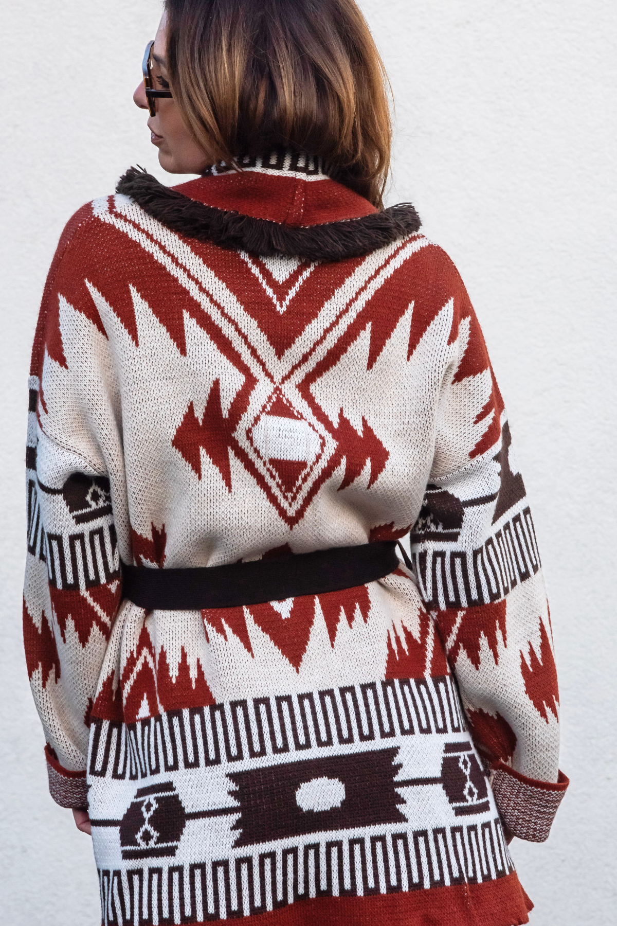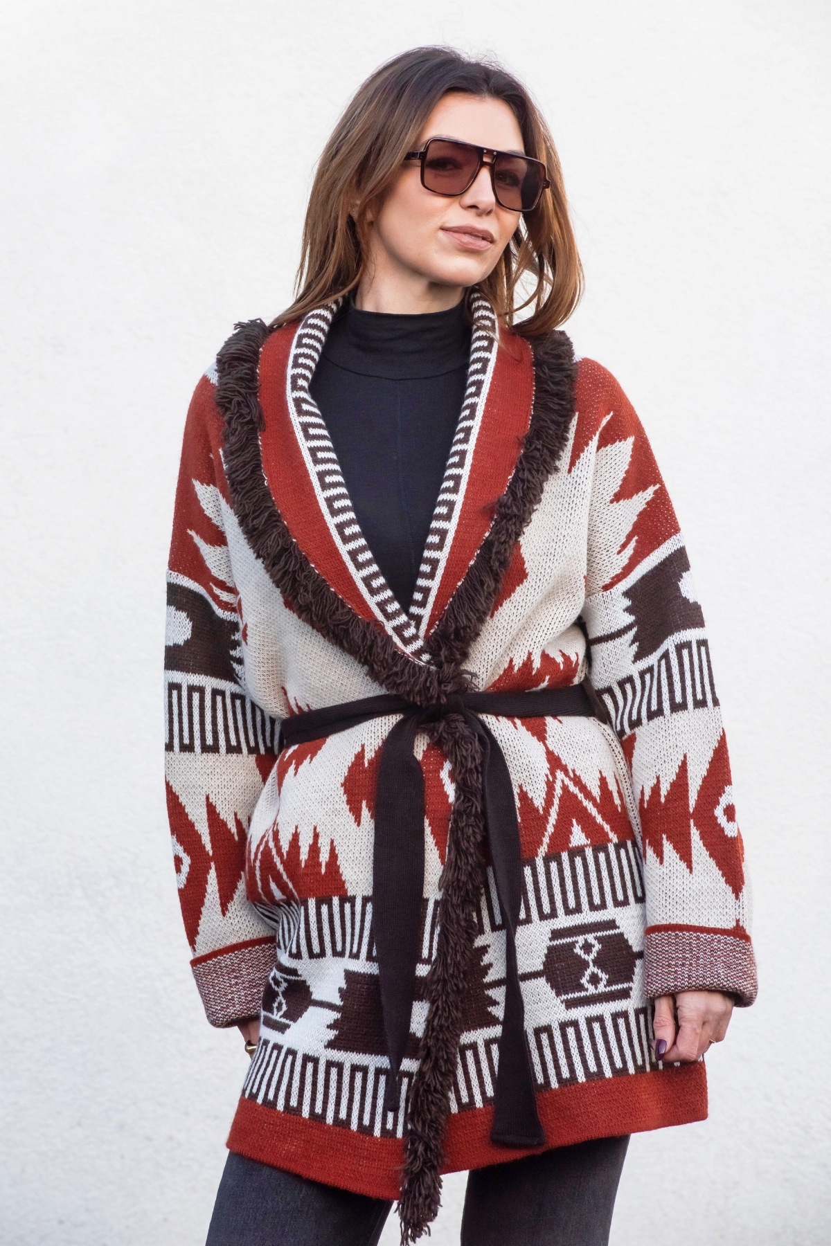 Being stylish and warm in our oversized, Bohemian-inspired Astrid cardigan. It features a cozy chunky knit and a sophisticated fringed shawl collar, defined by a bold geometric pattern in earthy tones and cinched with a detachable self-tie belt.