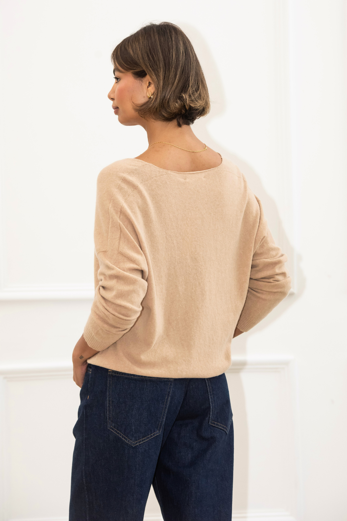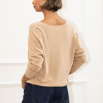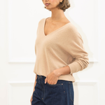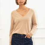 Libby Loves' new shape for AW24 - Camilla the lightweight V-neck. A loose fitting jumper with long sleeve and dropped shoulders to create an instantly laid back effortless look. The V-neck features a raw-cut look and the slight round cut shape adds to the relaxed shape.