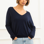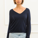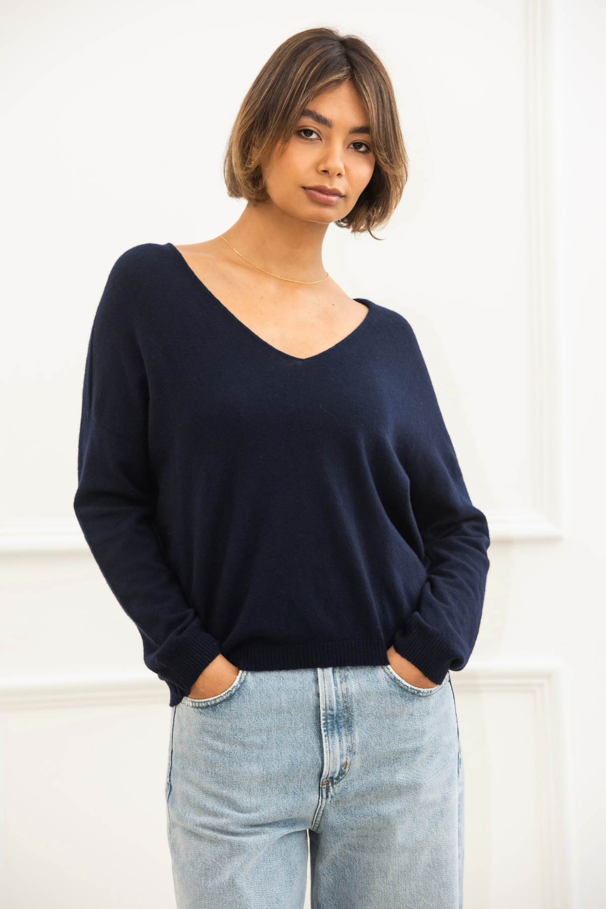 Libby Loves' new shape for AW24 - Camilla the lightweight V-neck. A loose fitting jumper with long sleeve and dropped shoulders to create an instantly laid back effortless look. The V-neck features a raw-cut look and the slight round cut shape adds to the relaxed shape.