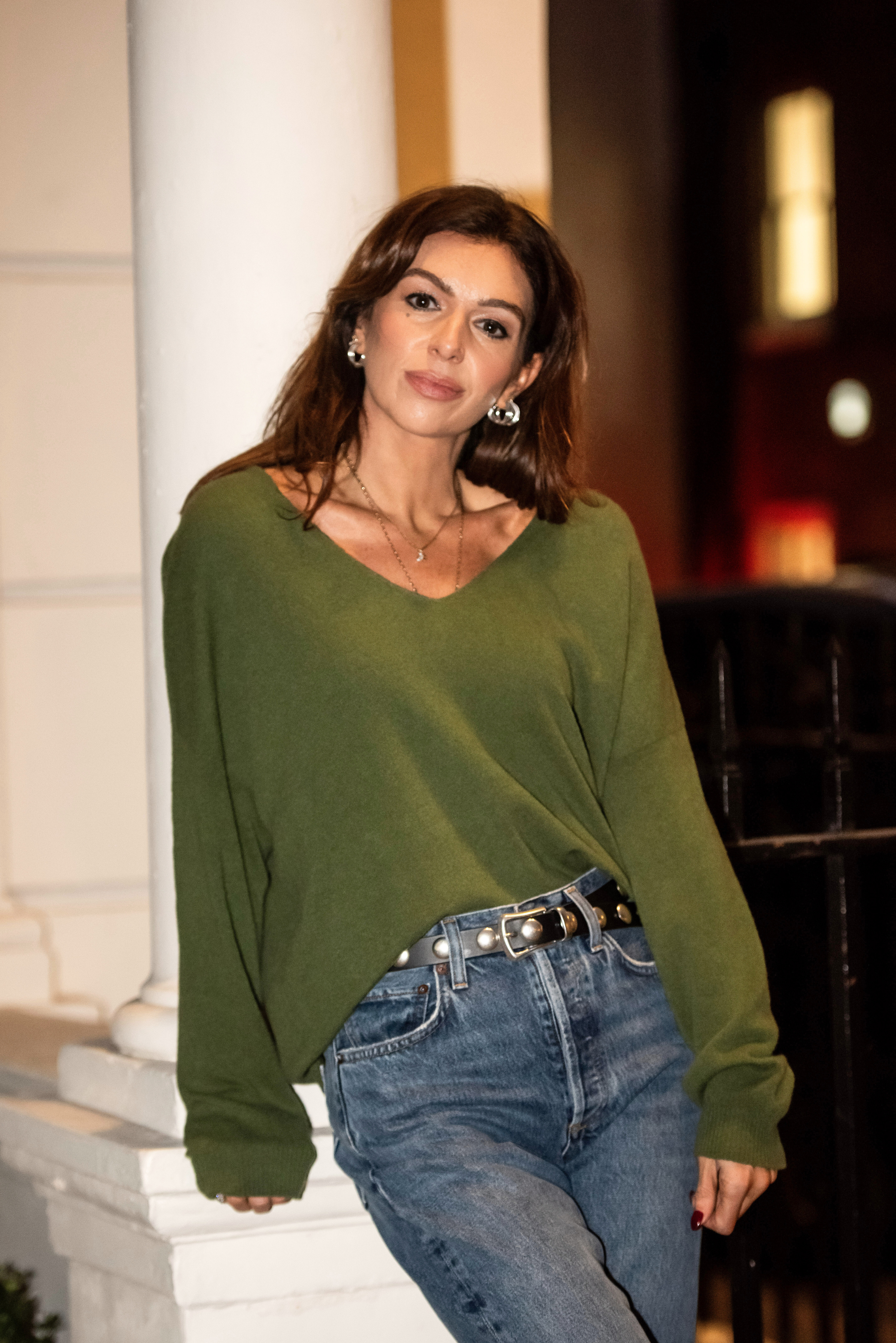 Libby Loves' new shape for AW24 - Camilla the lightweight V-neck. A loose fitting jumper with long sleeve and dropped shoulders to create an instantly laid back effortless look. The V-neck features a raw-cut look and the slight round cut shape adds to the relaxed shape.