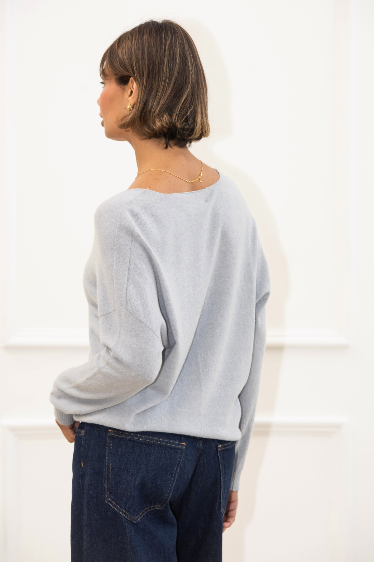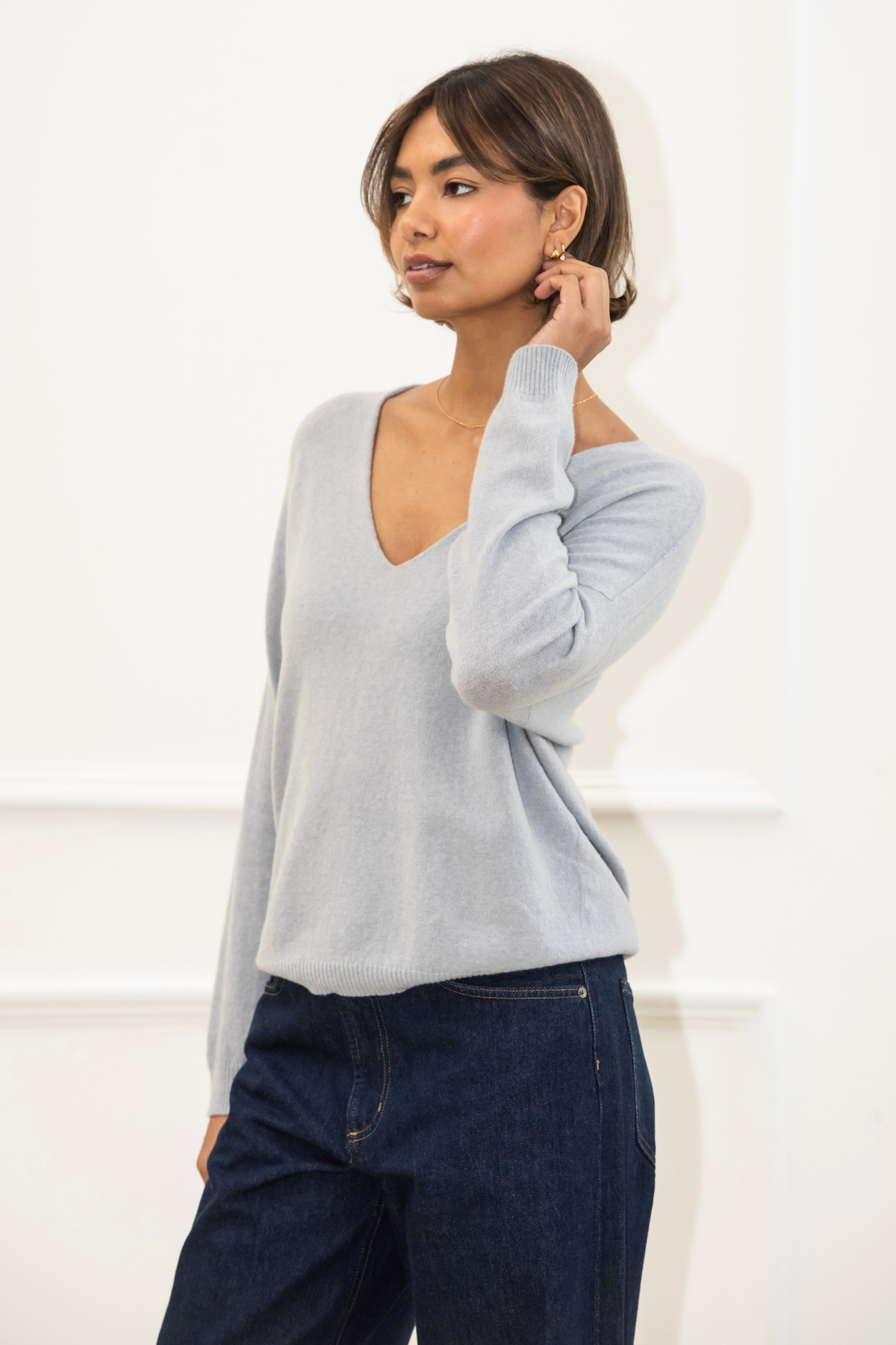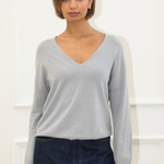 Libby Loves' new shape for AW24 - Camilla the lightweight V-neck. A loose fitting jumper with long sleeve and dropped shoulders to create an instantly laid back effortless look. The V-neck features a raw-cut look and the slight round cut shape adds to the relaxed shape.