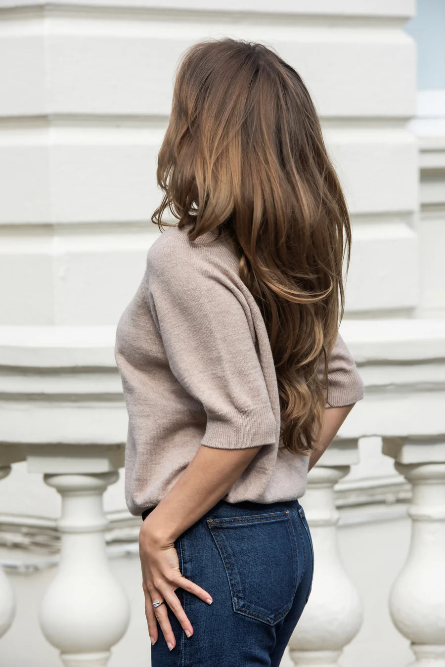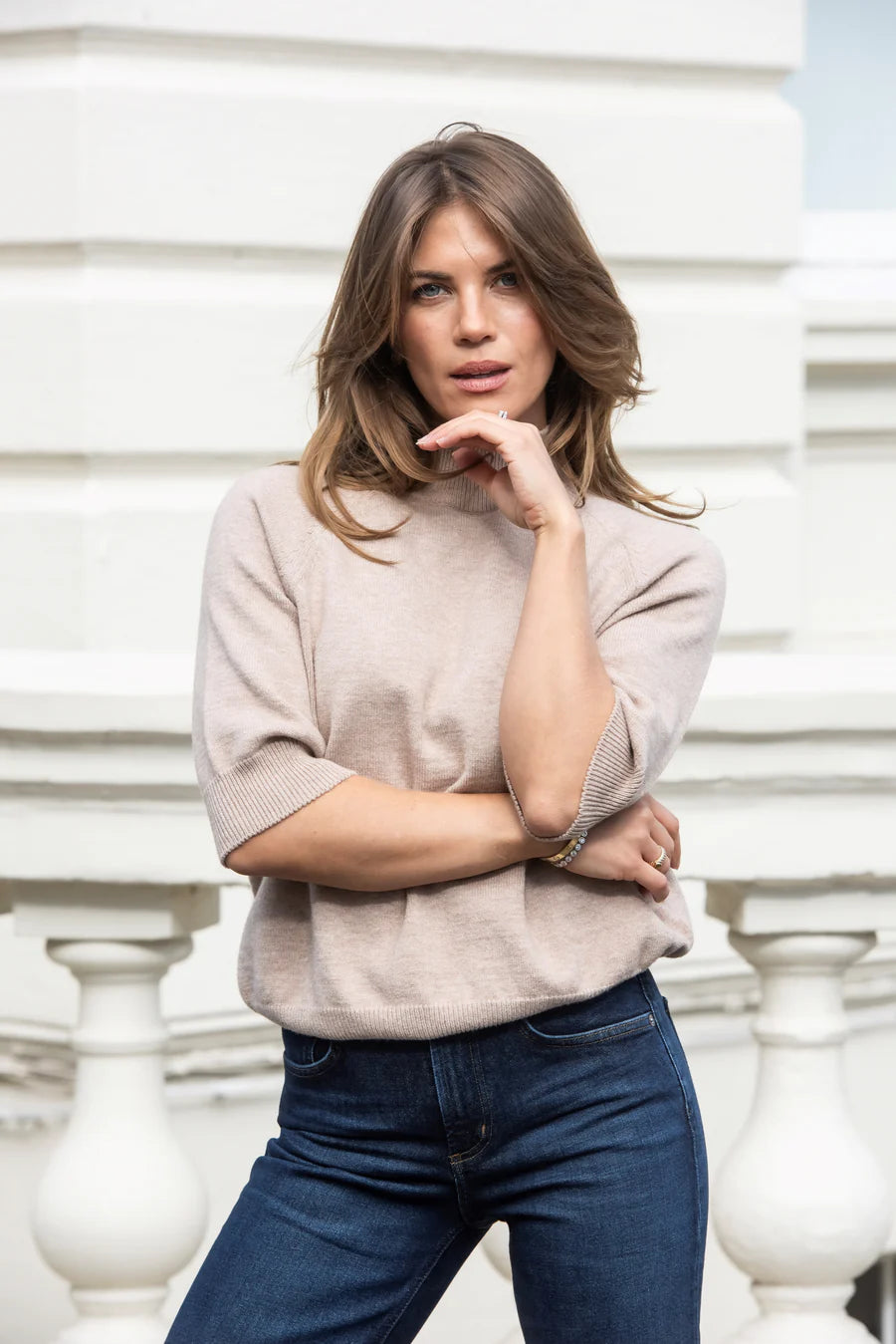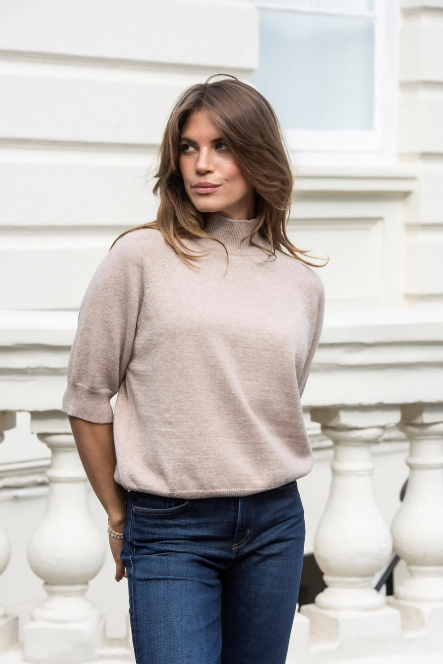 Lightweight knitted jumper with mid-length sleeves from Libby Loves. The Carrie has a turtleneck, loose fit and ribbed edging. Perfect for everyday dressing as well as paired with a mini skirt and boots for dinner on town.