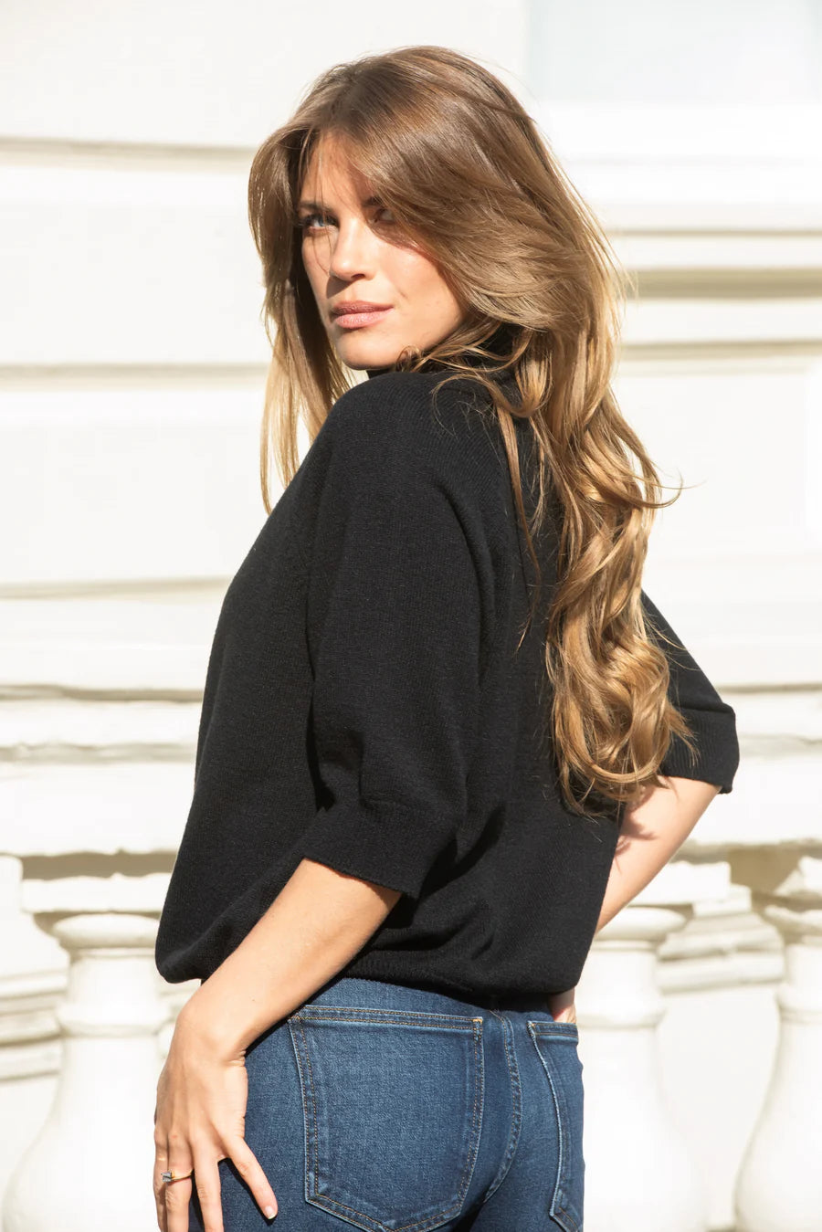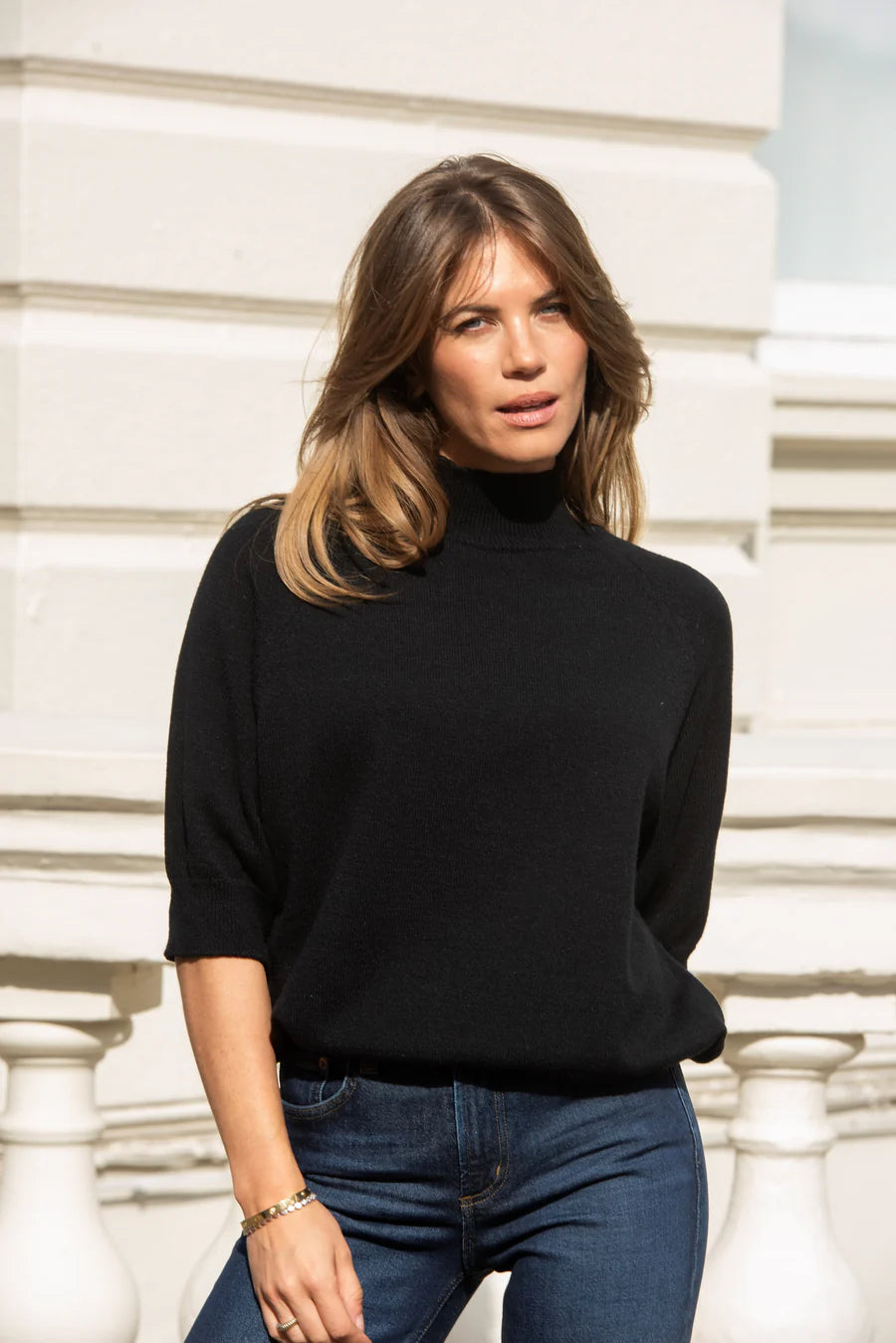 Lightweight knitted jumper with mid-length sleeves from Libby Loves. The Carrie has a turtleneck, loose fit and ribbed edging. Perfect for everyday dressing as well as paired with a mini skirt and boots for dinner on town.