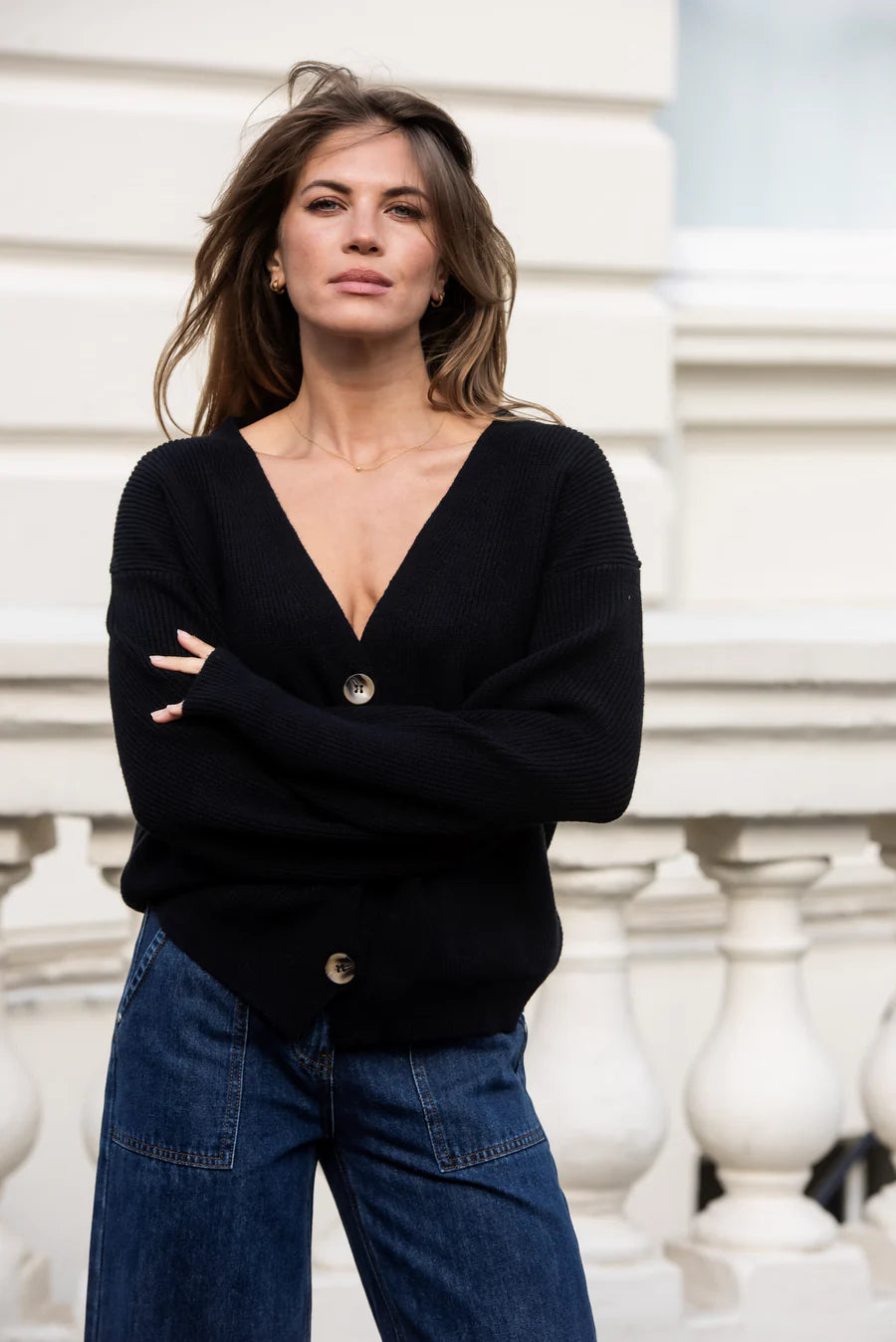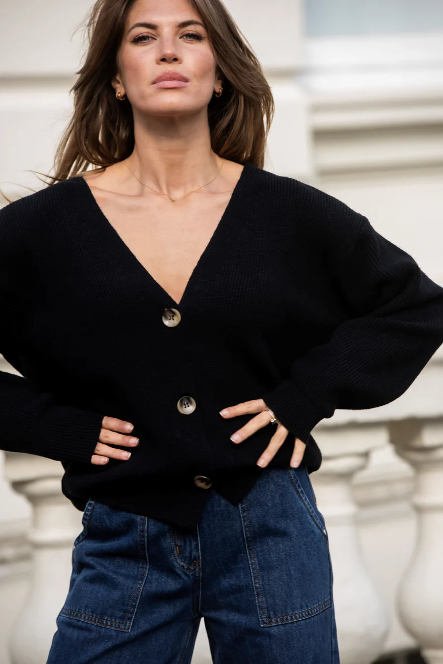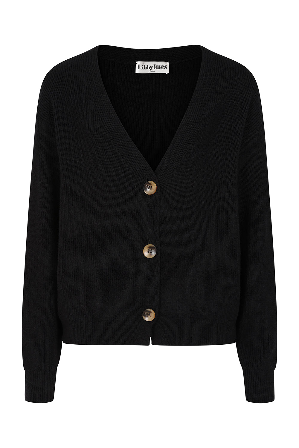 Knitted cardigan with long balloon sleeves from Libby Loves. The Cass has a wide V-neck, loose fit and brown button closure. Ideal for a casual everyday layer, paired perfectly with denim or suit trousers.