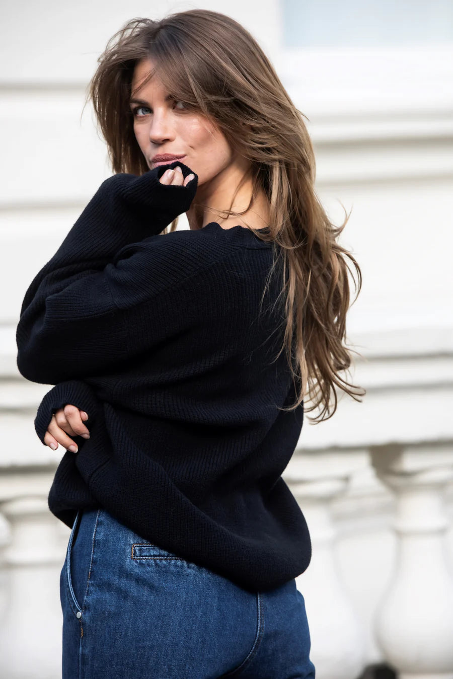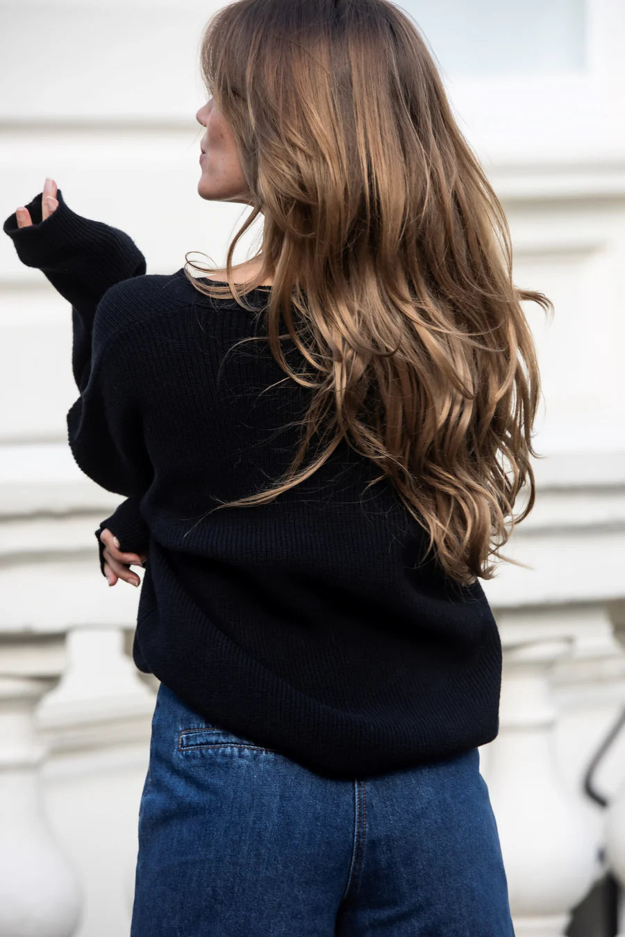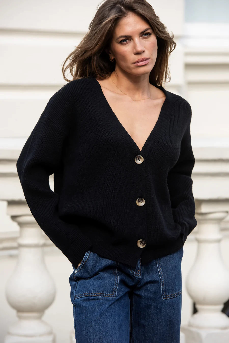 Knitted cardigan with long balloon sleeves from Libby Loves. The Cass has a wide V-neck, loose fit and brown button closure. Ideal for a casual everyday layer, paired perfectly with denim or suit trousers.