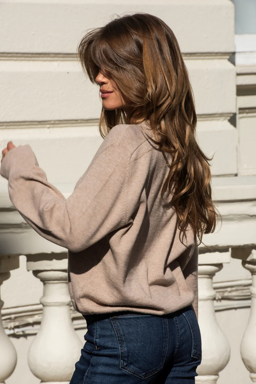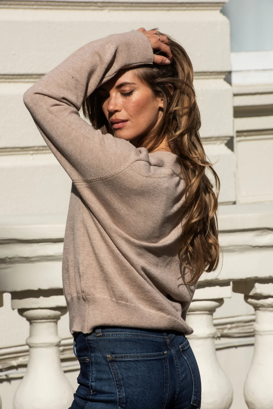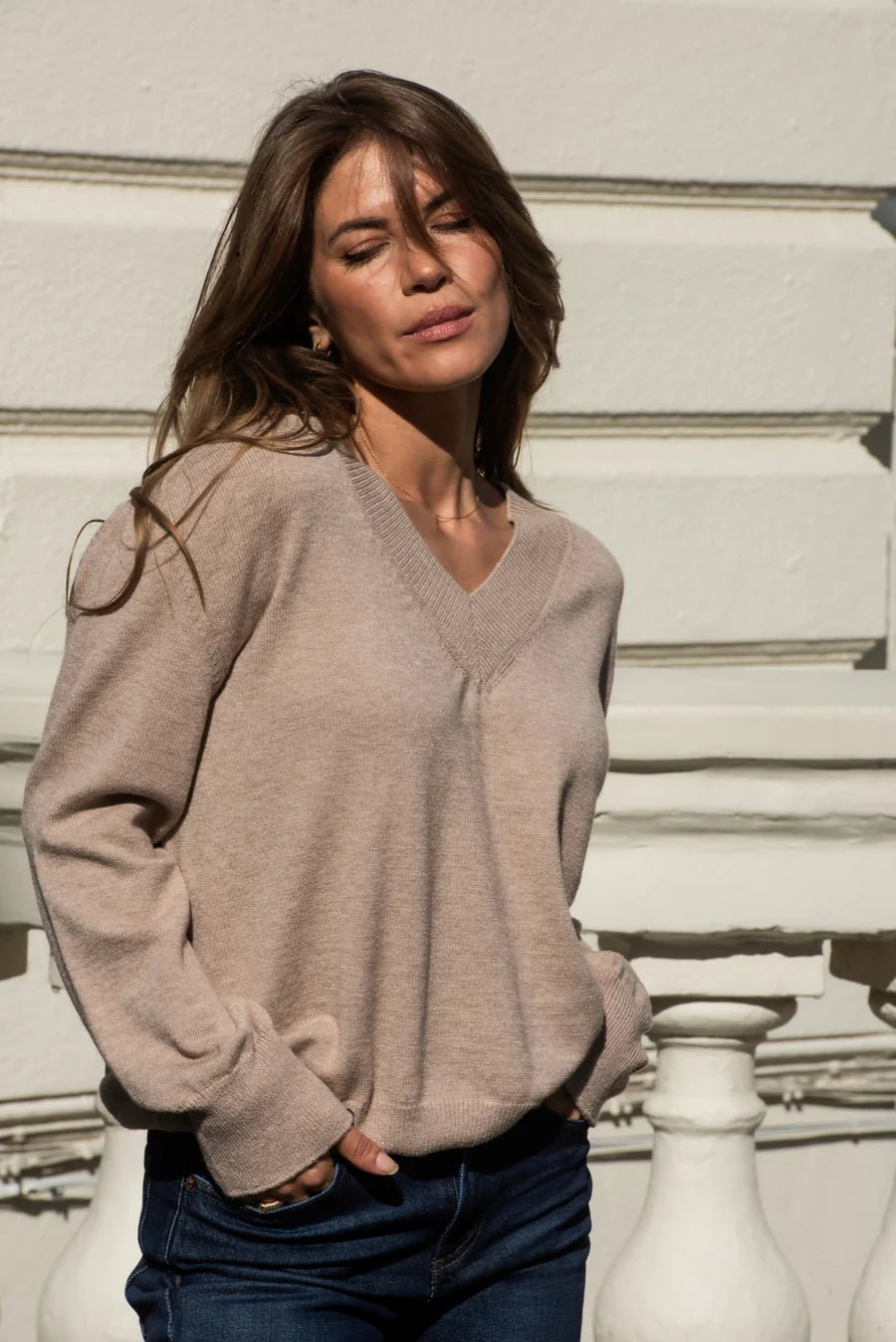 Loose fit knit with wide V-neck from Libby Loves. The Charlie has dropped shoulder and long loose sleeves. Ideal for a casual everyday layer, paired perfectly with denim or suit trousers.