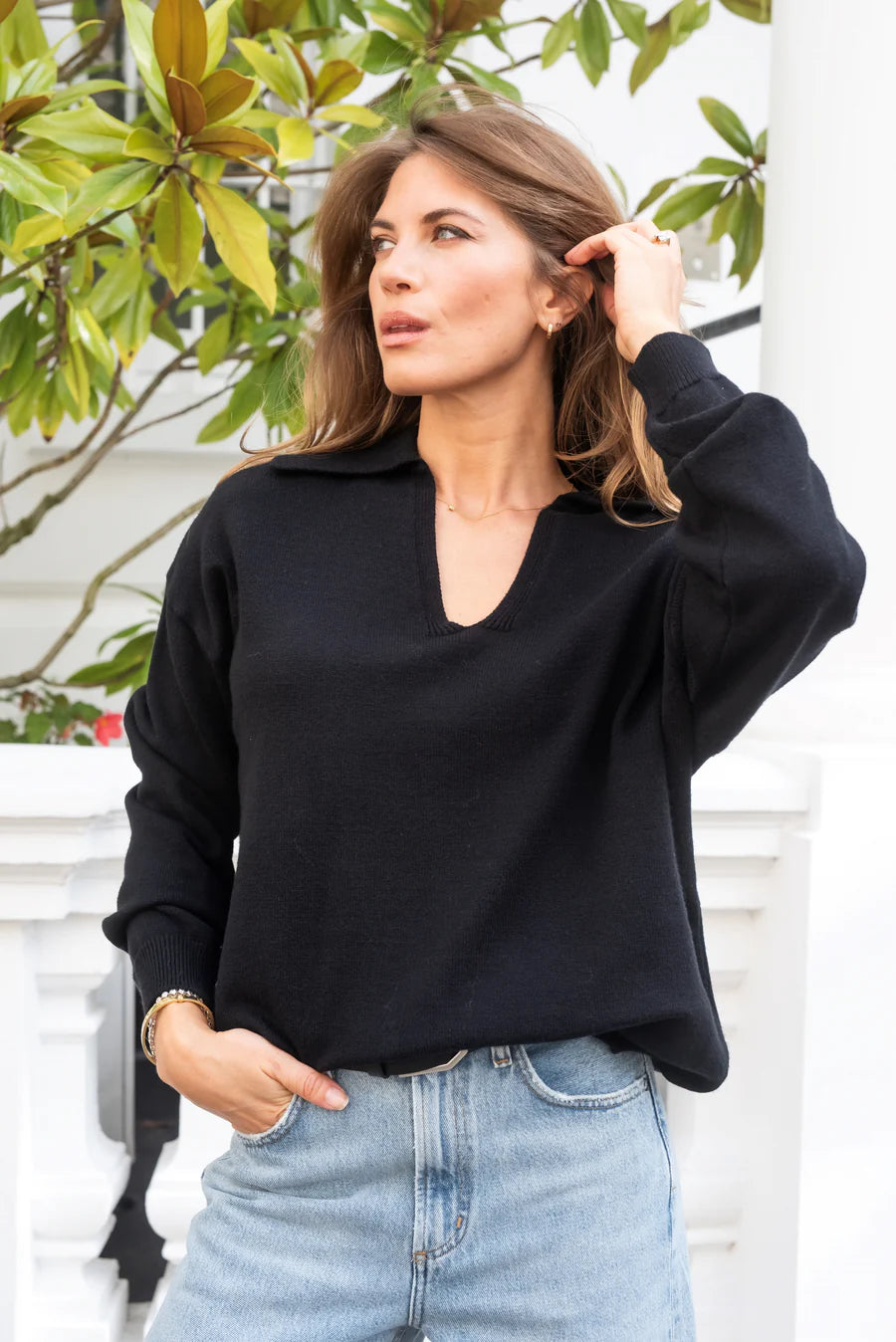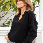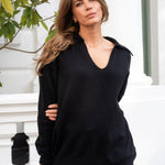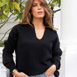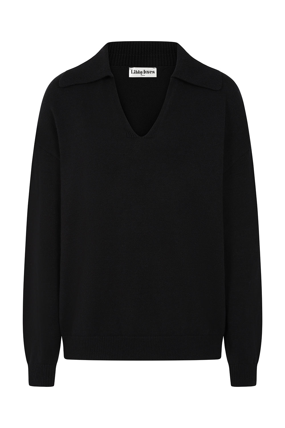 Knitted polo jumper with classic V-neck with collar from Libby Loves. The Cole has a loose fit, dropped shoulder and long loose sleeves. Ideal for a casual everyday layer, paired perfectly with denim or suit trousers.