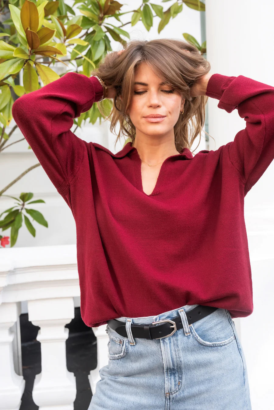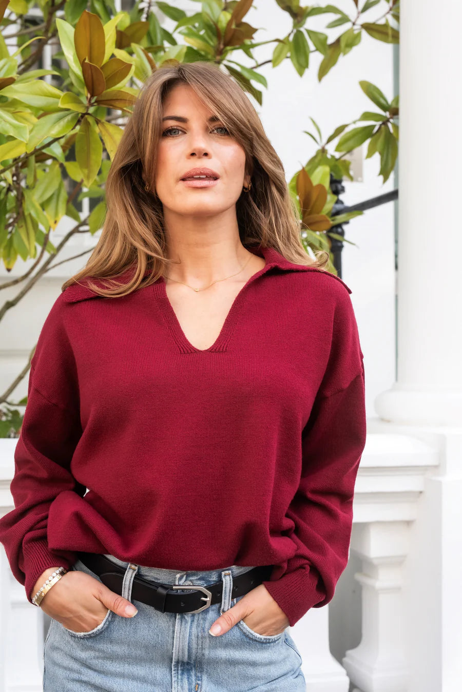 Knitted polo jumper with classic V-neck with collar from Libby Loves. The Cole has a loose fit, dropped shoulder and long loose sleeves. Ideal for a casual everyday layer, paired perfectly with denim or suit trousers.
