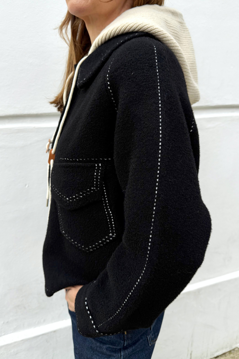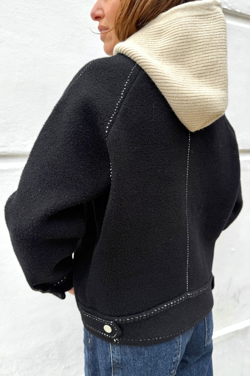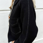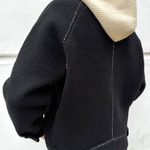 By popular demand, Libby Loves presents the first drop of the Winter ’25 collection - the best-selling fuzzy jacket, now available in more colors and styles. This is the Fallon Hood Jacket, featuring a contrasting cream-colored hood that can be removed at any time, with integrated drawstring cords and leather-tone cord detailing. It has a pop-metal button closure, patch pockets with flaps, and decorative white stitching along the seams. Available in Black, Deep Red and Vanilla.