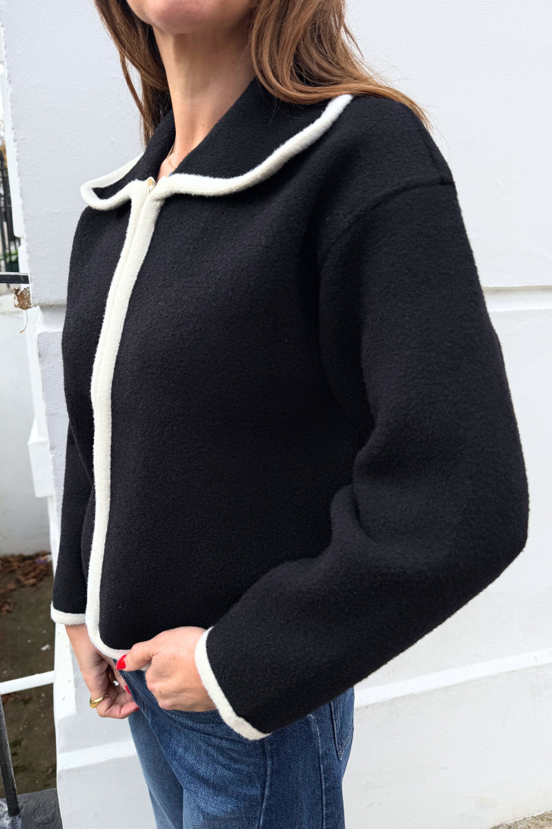By popular demand, Libby Loves presents the first drop of the Winter ’25 collection - the best-selling fuzzy jacket, now available in more colors and styles. This Fern Trim Jacket, crafted from a deep black viscose blend with ivory trim along the collar, zipper, and cuffs, combines cozy comfort with chic style. The full-length front zipper and long sleeves with ribbed cuffs make it a versatile winter essential. Available in Black and Vanilla.