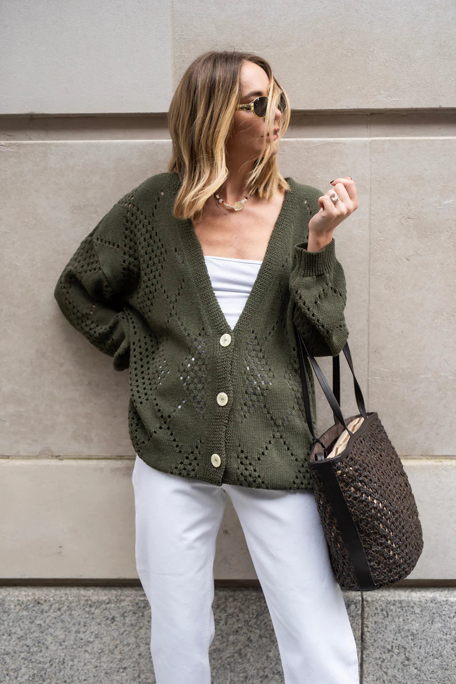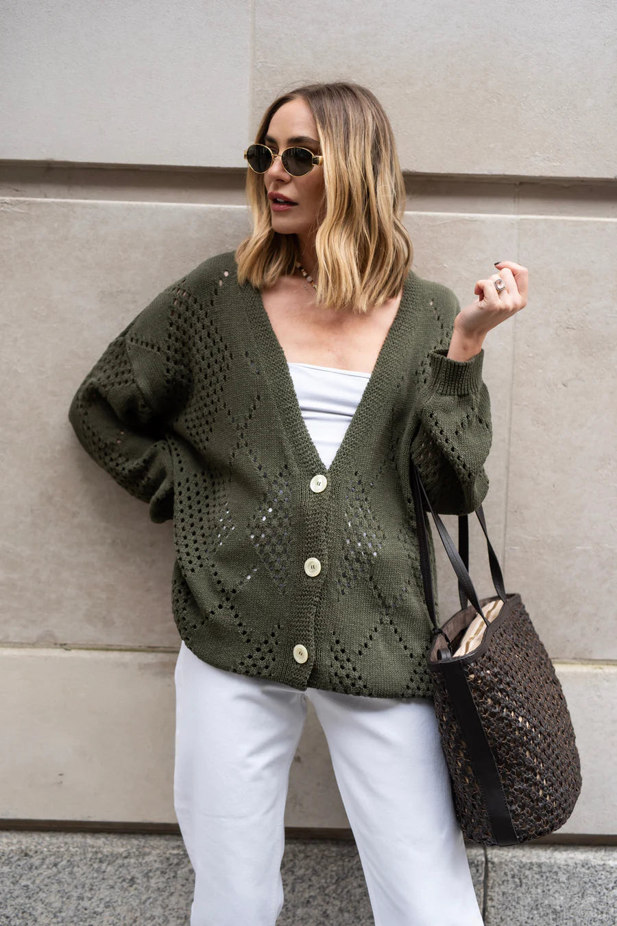 The Florence cardigan is your new favourite go-to cardigan, a soft slouchy silhouette with a button front, subtle harlequin crochet pattern and ribbed cuff and hem. Wear this piece over a simple camisole and trousers or go for a vintage boho look and style with maxi dresses and skirts instead of a classic jacket to give a free spirited summer look. Made from a super soft cotton blend this will be worn over and over again as an extra layer when needed over summer months.