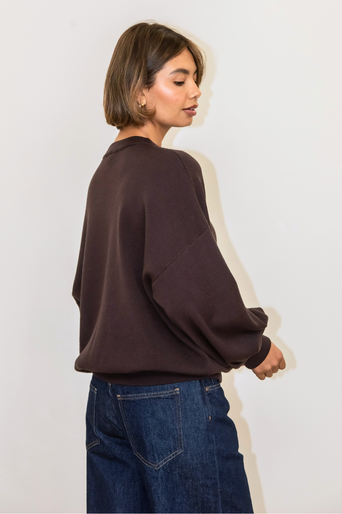 A relaxed-fit knitted sweater designed for effortless everyday wear in a dark brown colour. The silhouette is soft and easy, finished with ribbed edges for a clean, structured look. Balloon sleeves add gentle volume, while cinched cuffs keep the shape refined and simple. This Sweater comes in 2 other colours Navy and Black.