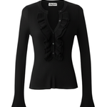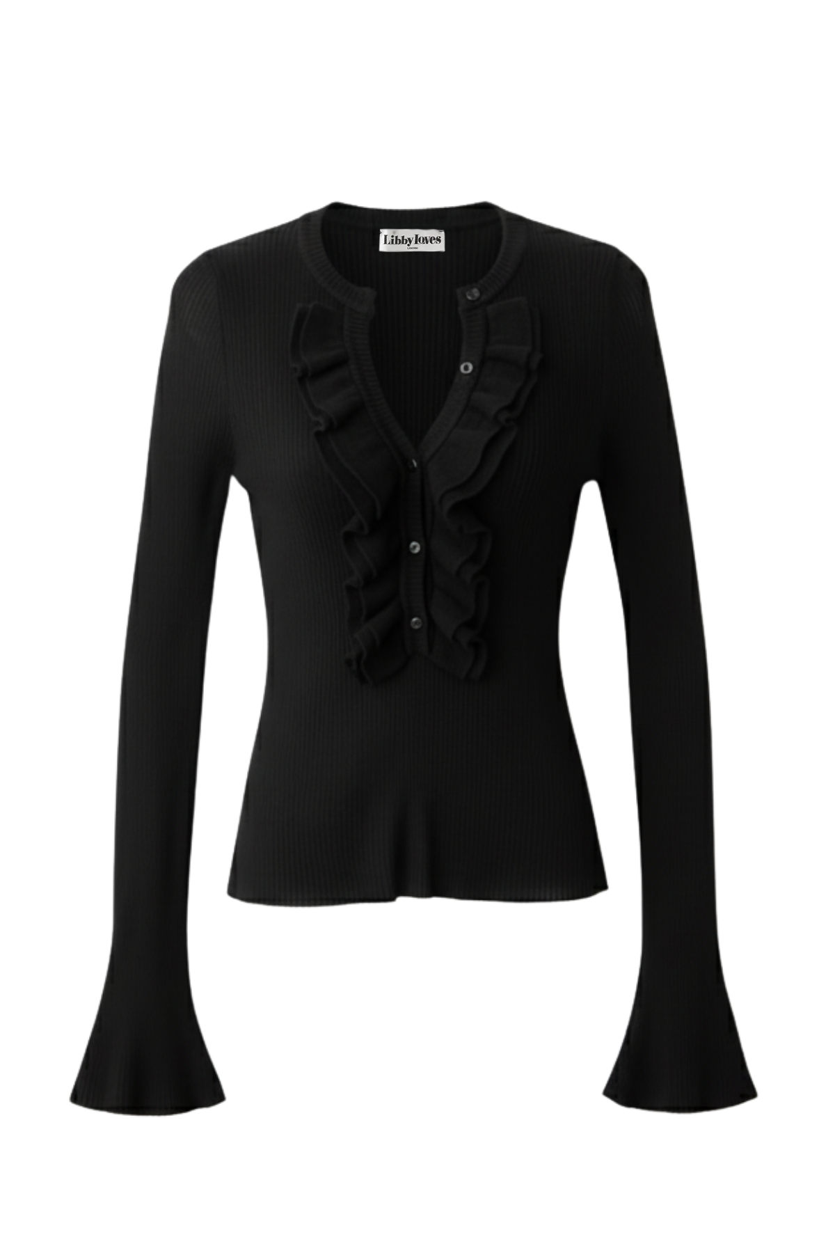 The Gracie Frill Top is a chic ribbed knit in black shade, featuring delicate ruffle details and a flattering silhouette. Small dark buttons along the front placket and subtly flared long sleeves add a refined, elegant touch. Available in 3 colours: Burgundy, Black, and Brown