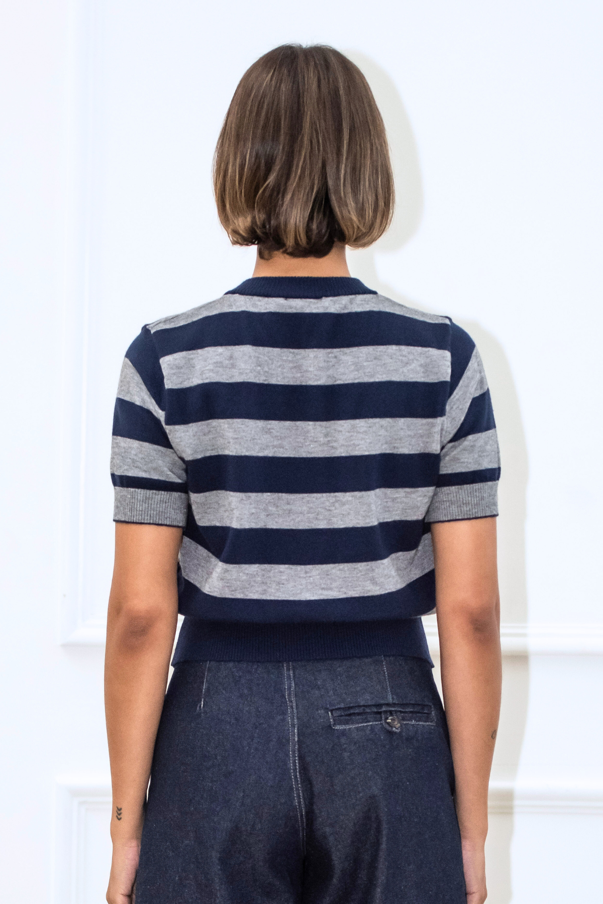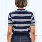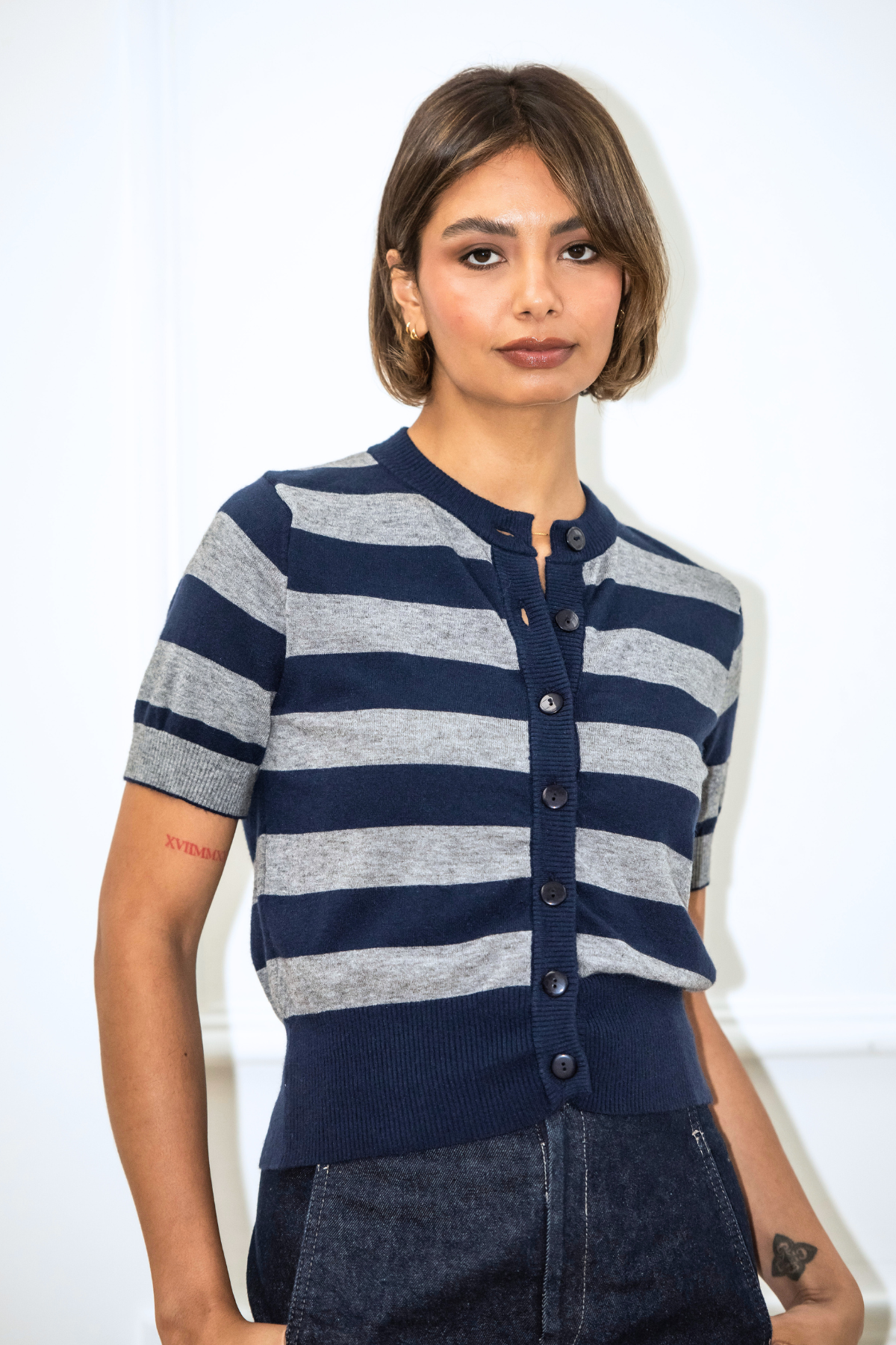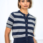 Make a statement with the Greta Stripe Cardigan, featuring a striking horizontal stripe pattern in navy and grey. Designed with a classic round neckline, short sleeves, and a button-front closure, this cardigan is a versatile layering piece that pairs with jackets, coats, or on its own.