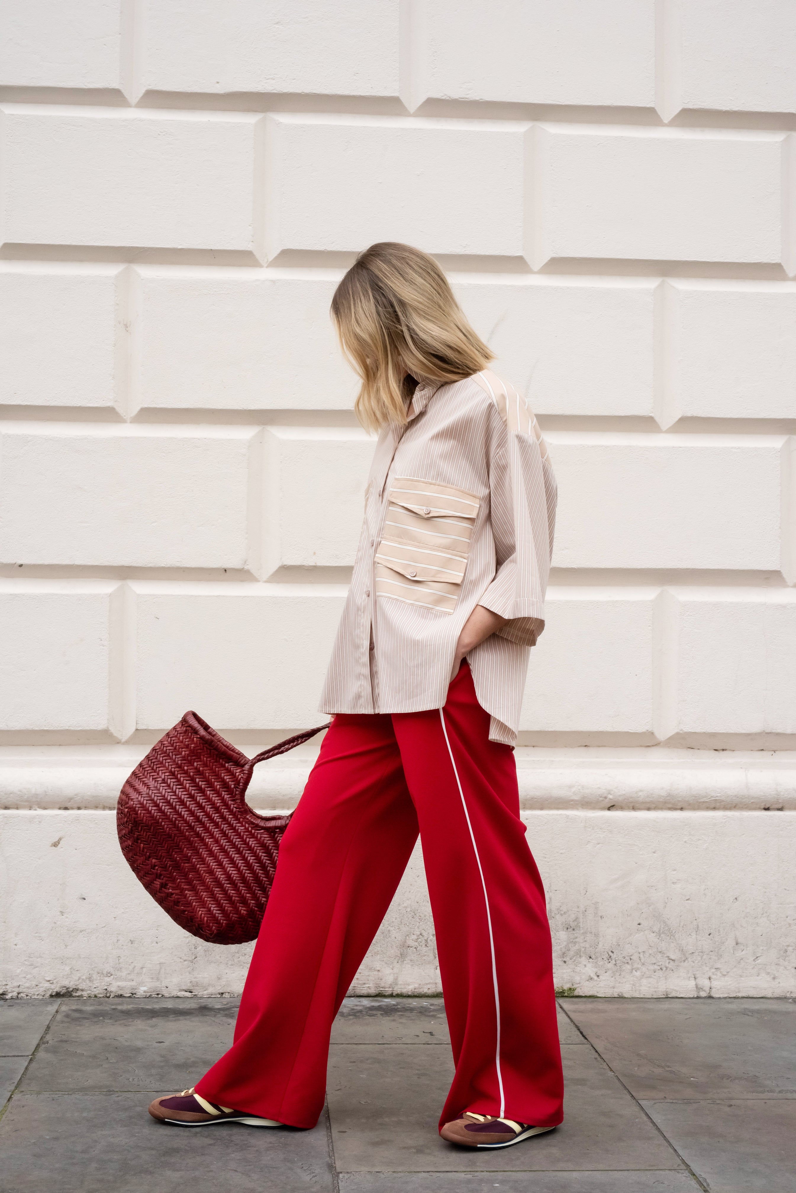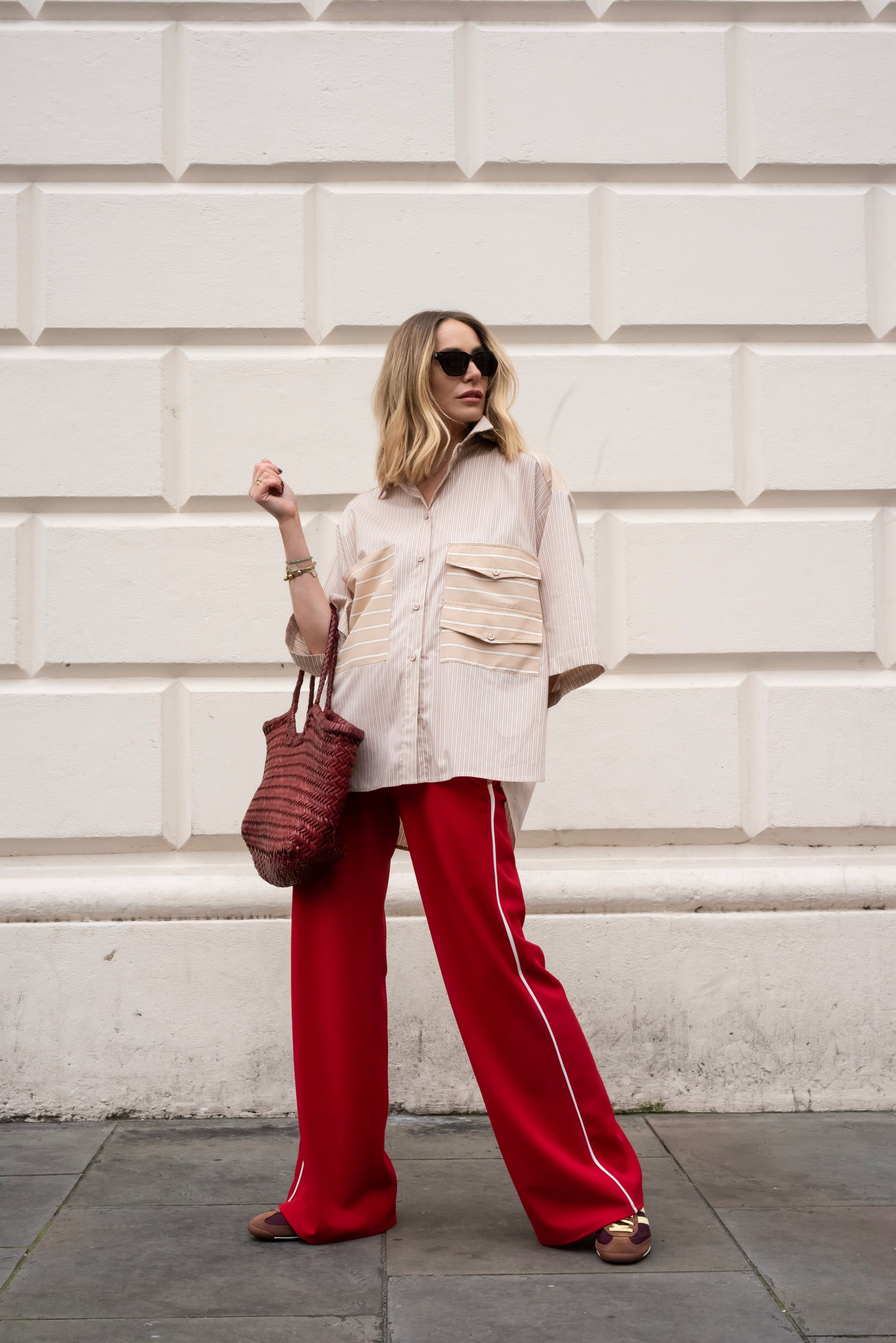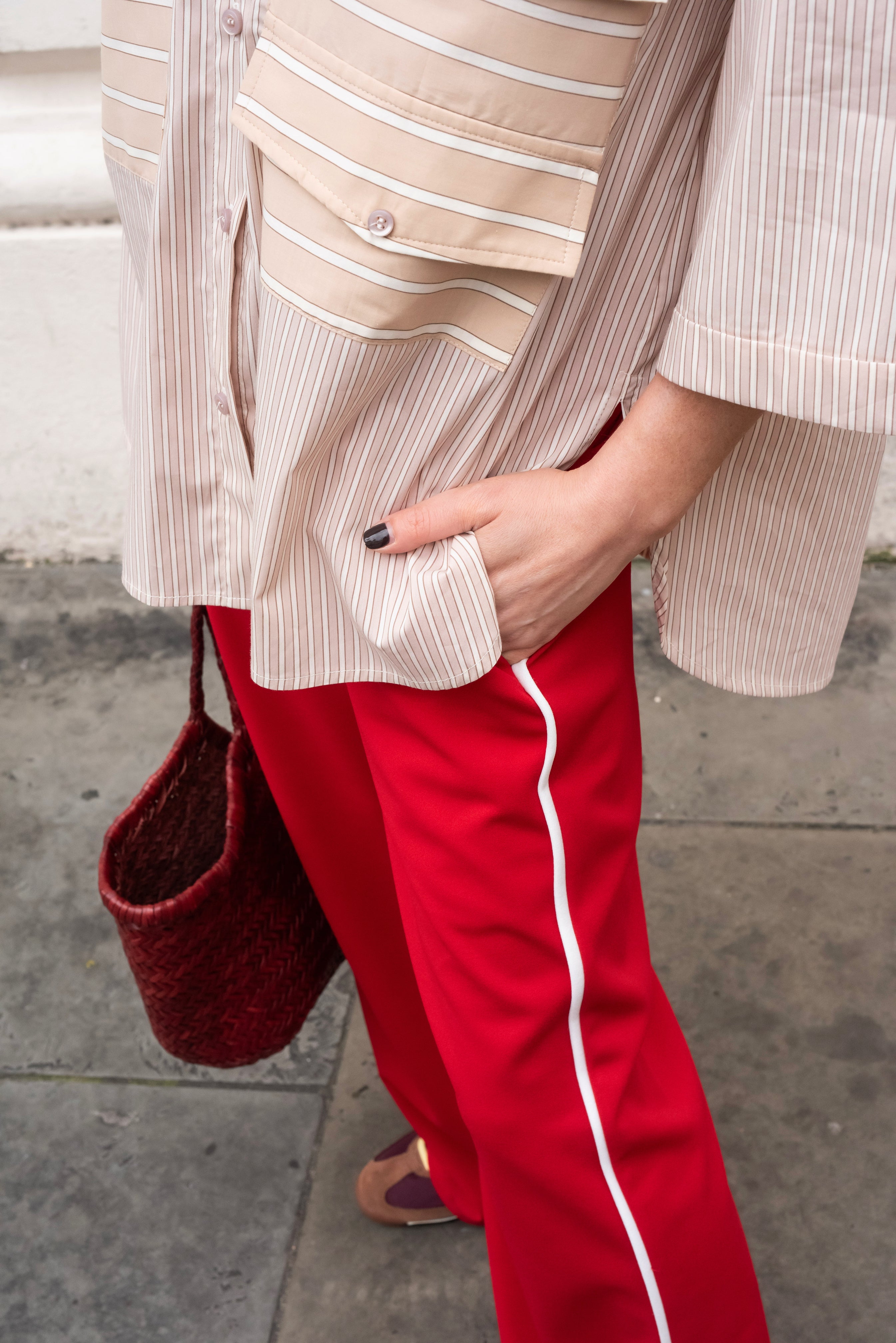 Oversized shirt with dropped shoulders and mid-length sleeves. It features classic collar and button closure with chest pockets and mixed stripes in Beige.
