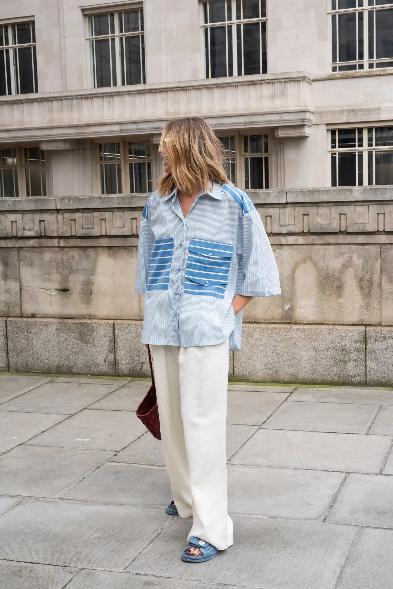 Oversized shirt with dropped shoulders and mid-length sleeves. It features classic collar and button closure with chest pockets and mixed stripes in Blue.