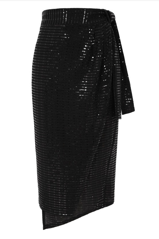 Let this stretchy wrap skirt with all over black sparkle take you through the party period. Mid length, wrap pencil skirt with slit and a tie belt to fasten.