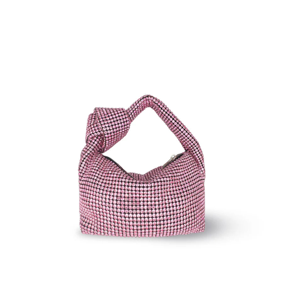 Diamanté encrusted bag with short handle with knot. Perfect size to carry all the party essentials! Made from high quality crystal with premium hard ware this bag will be the perfect finishing touch to all your looks this season.