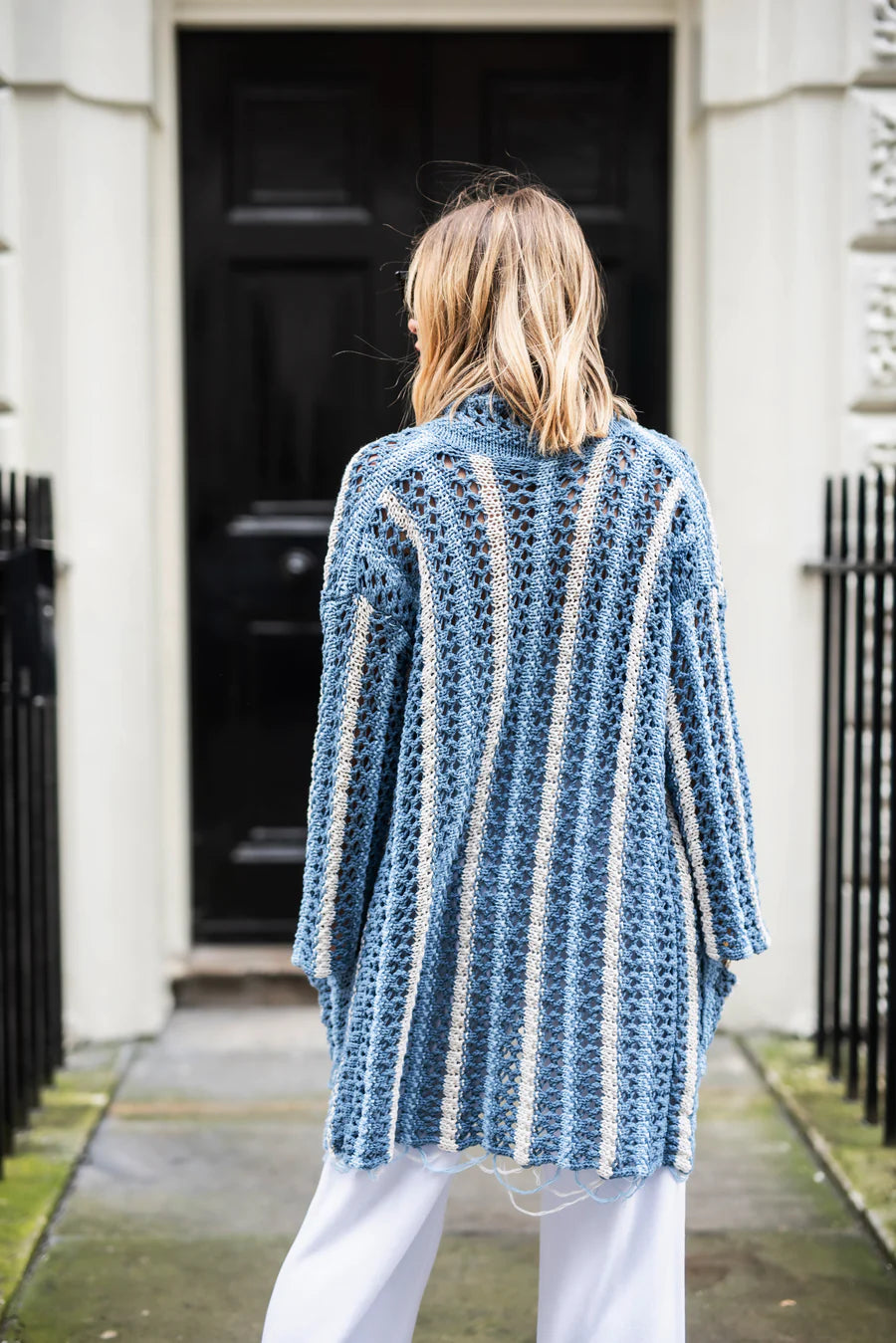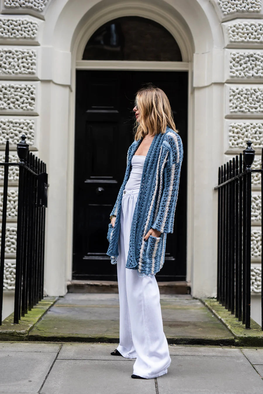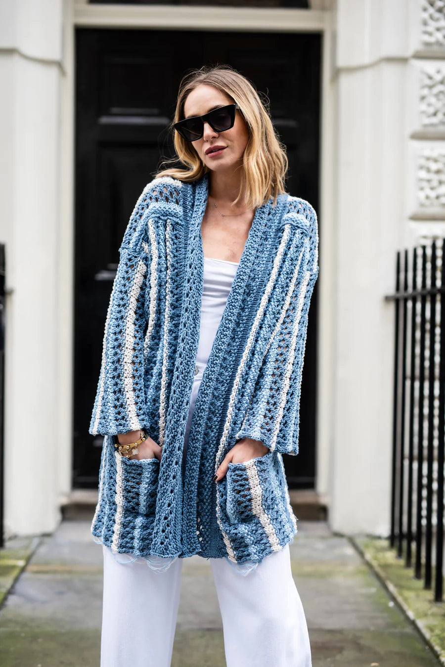 A great layering piece in a classic colour combination to wear over anything from a simple vest, dress or even swimwear. We adore this dreamy denim blue combination with white for a cool Summer look. The fit is super relaxed and slightly oversized without feeling too heavy, it has front pockets for extra ease and a unfinished hem to give a vintage feel.