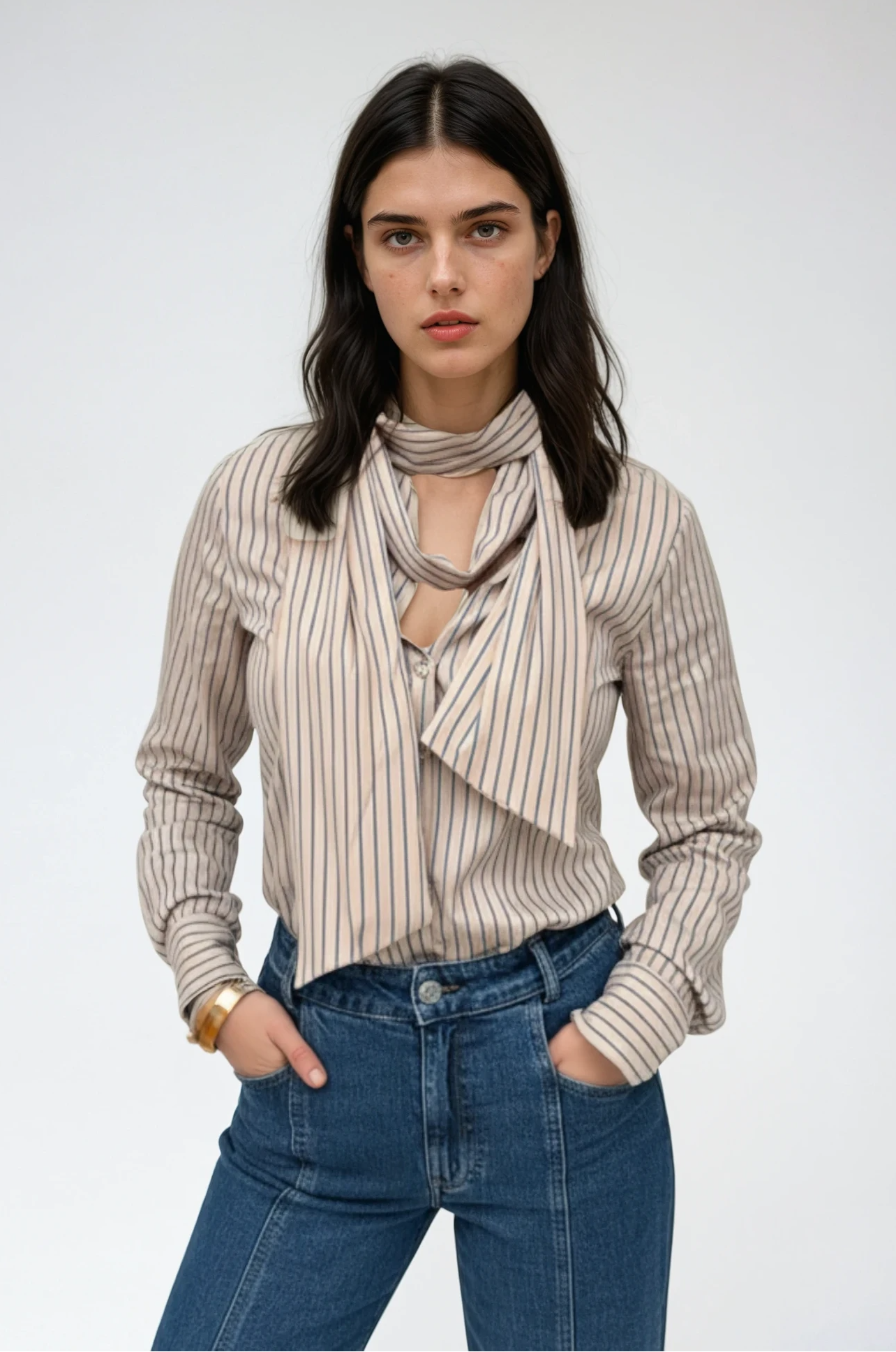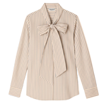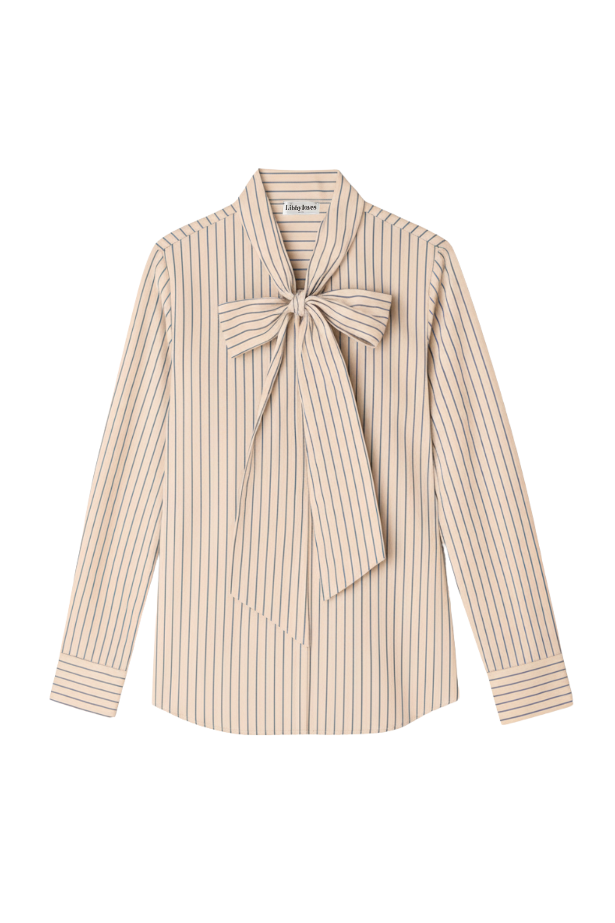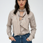 Sophisticated meets effortlessly cool in the Libby Loves Stripe Bow Shirt. Designed in a soft caramel base with fine navy vertical stripes, the shirt features a statement bow tie neckline that adds a polished, fashion-forward touch.