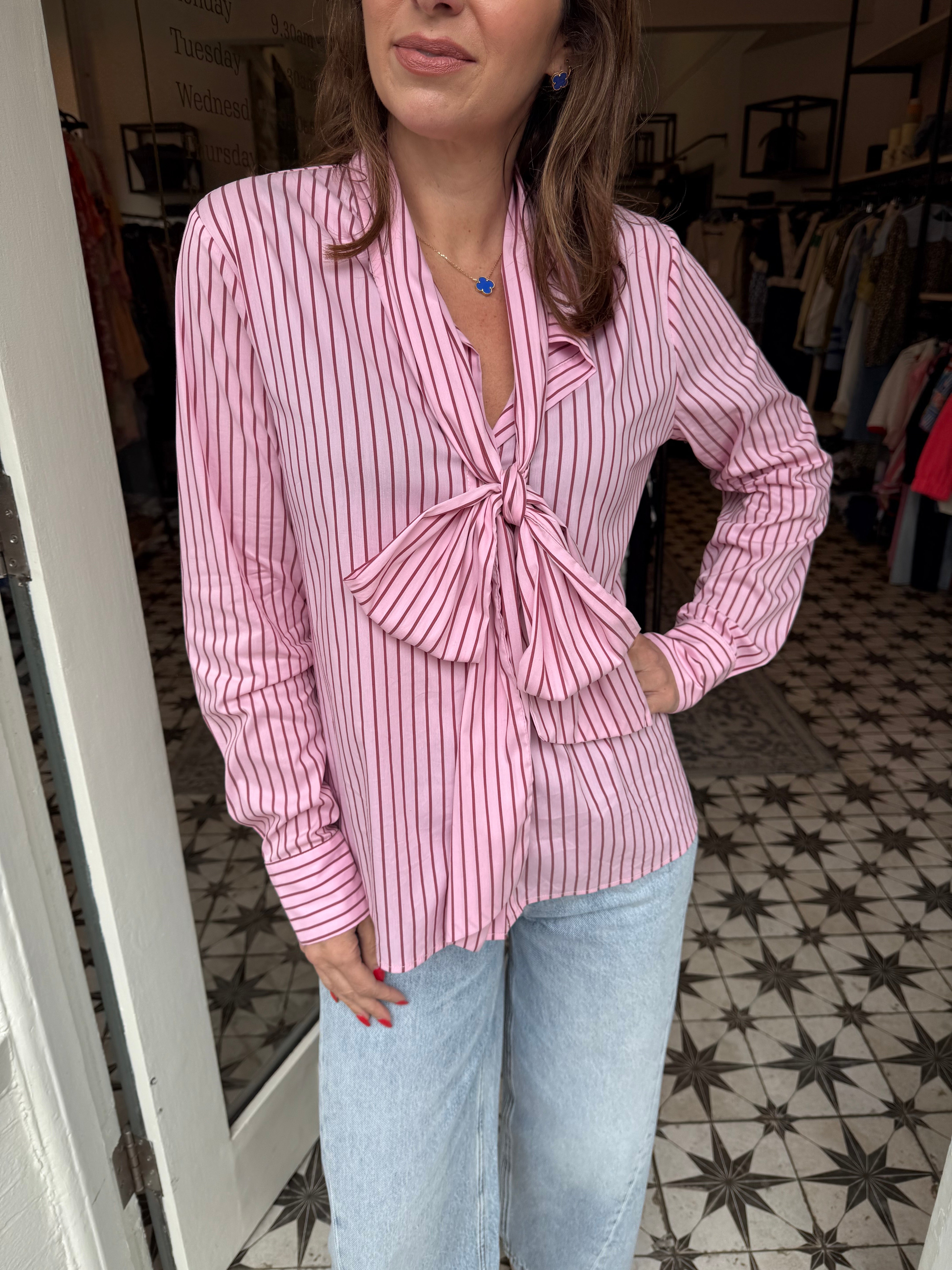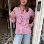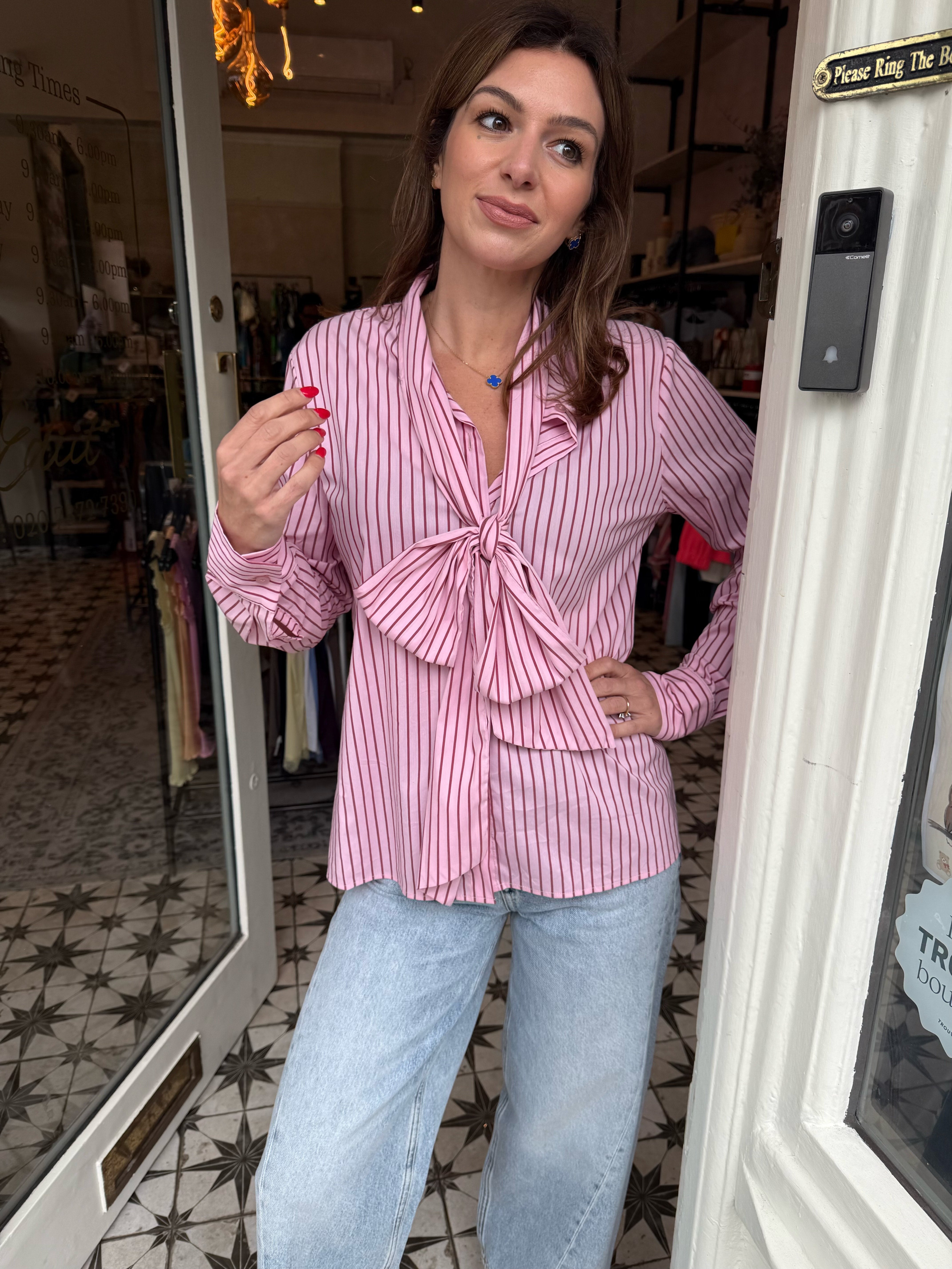 Sophisticated meets effortlessly cool in the Libby Loves Stripe Bow Shirt. Designed in a soft pink hue with refined vertical burgundy stripes, the shirt features a statement bow tie neckline that adds a polished, fashion-forward touch.