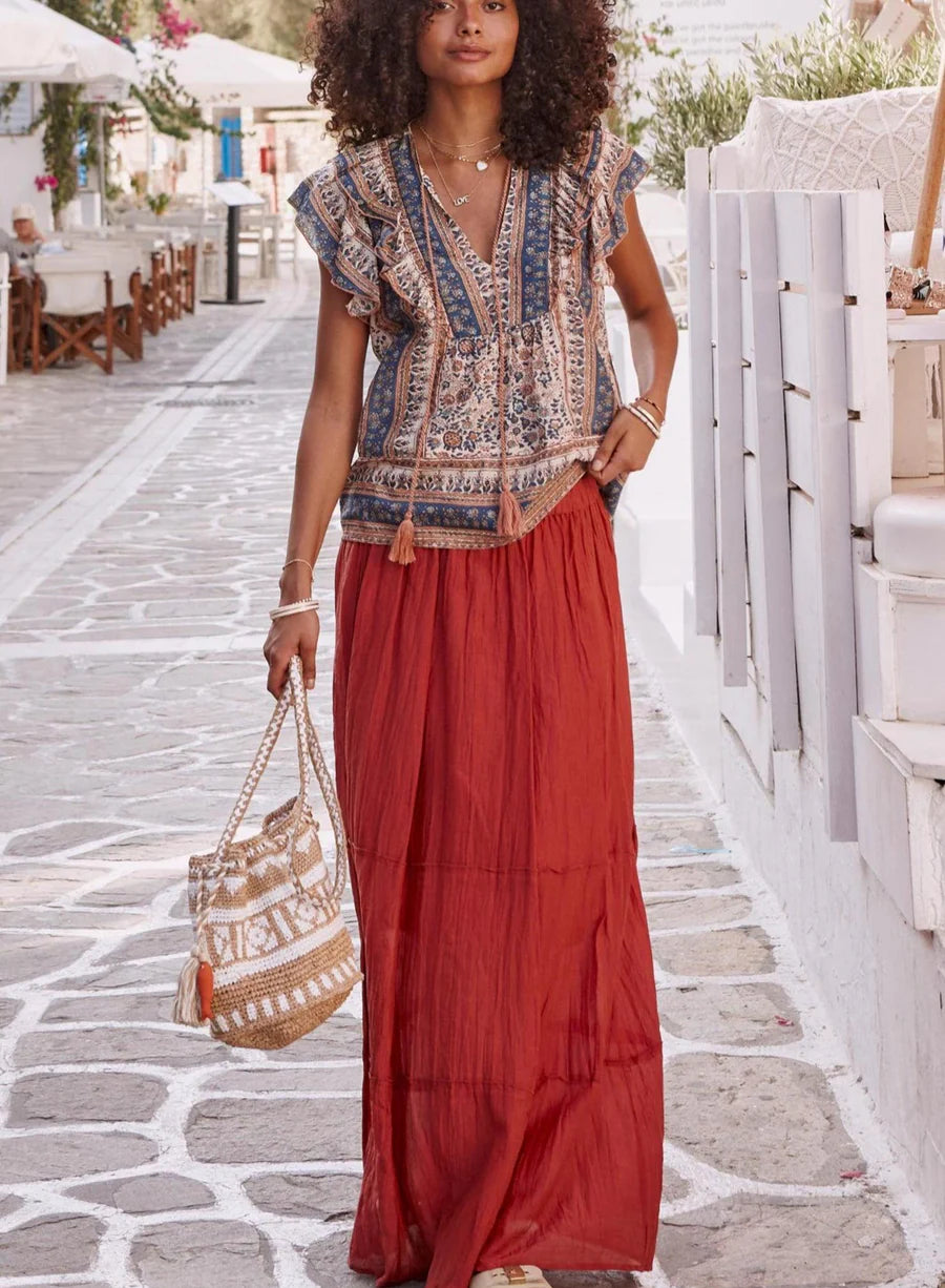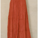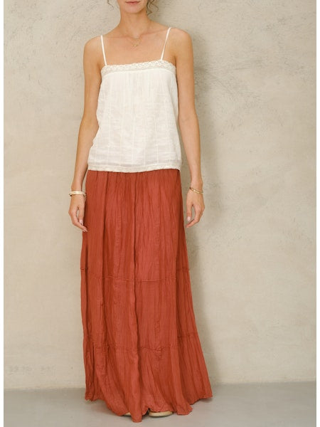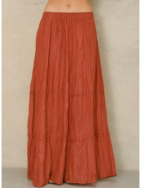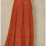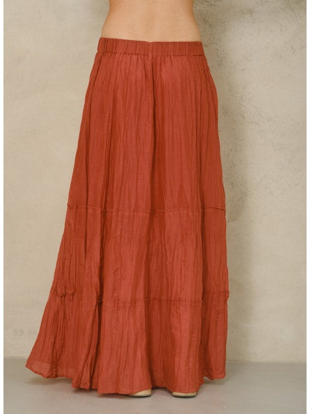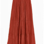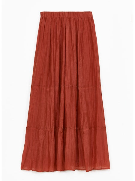 Maxi skirt with elasticated waist and tiered A-line. Comes in a beautiful rust colour.