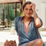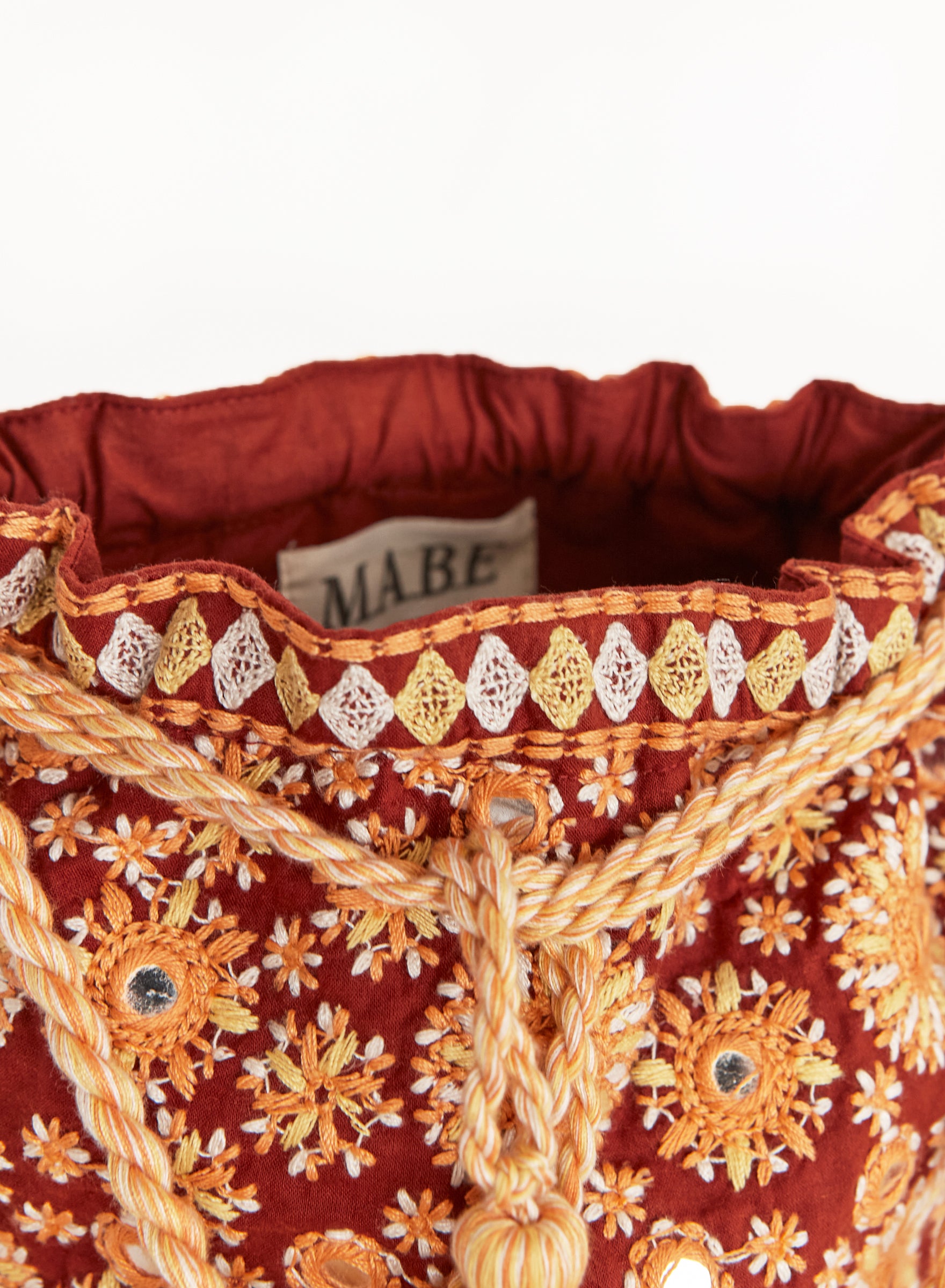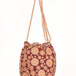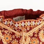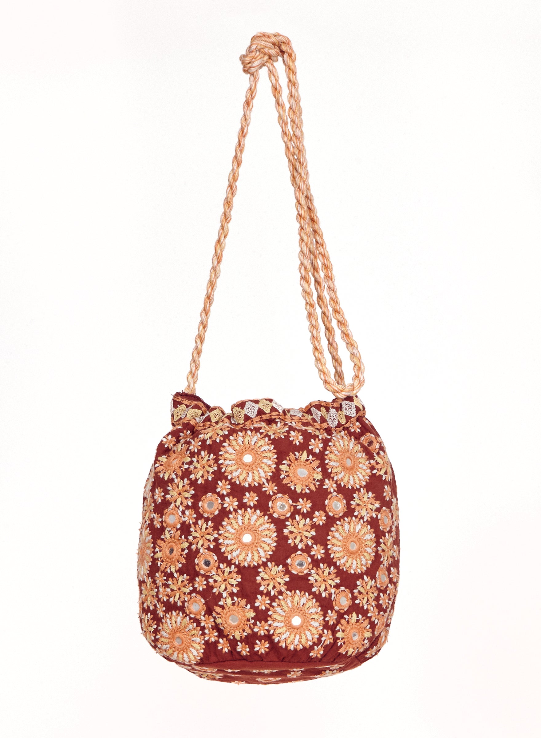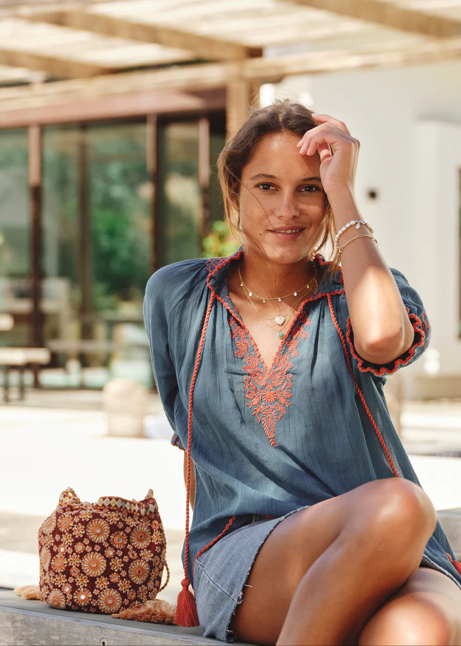 The Suri pouch blends intricate floral embroidery with shimmering mirrors for a romantic allure. The lightweight cotton base, multi-coloured cord, and tassel details give a soft, bohemian elegance, perfect to compliment your summer wardrobe. Wear it cross body or simply tie the cord and wear over one shoulder.